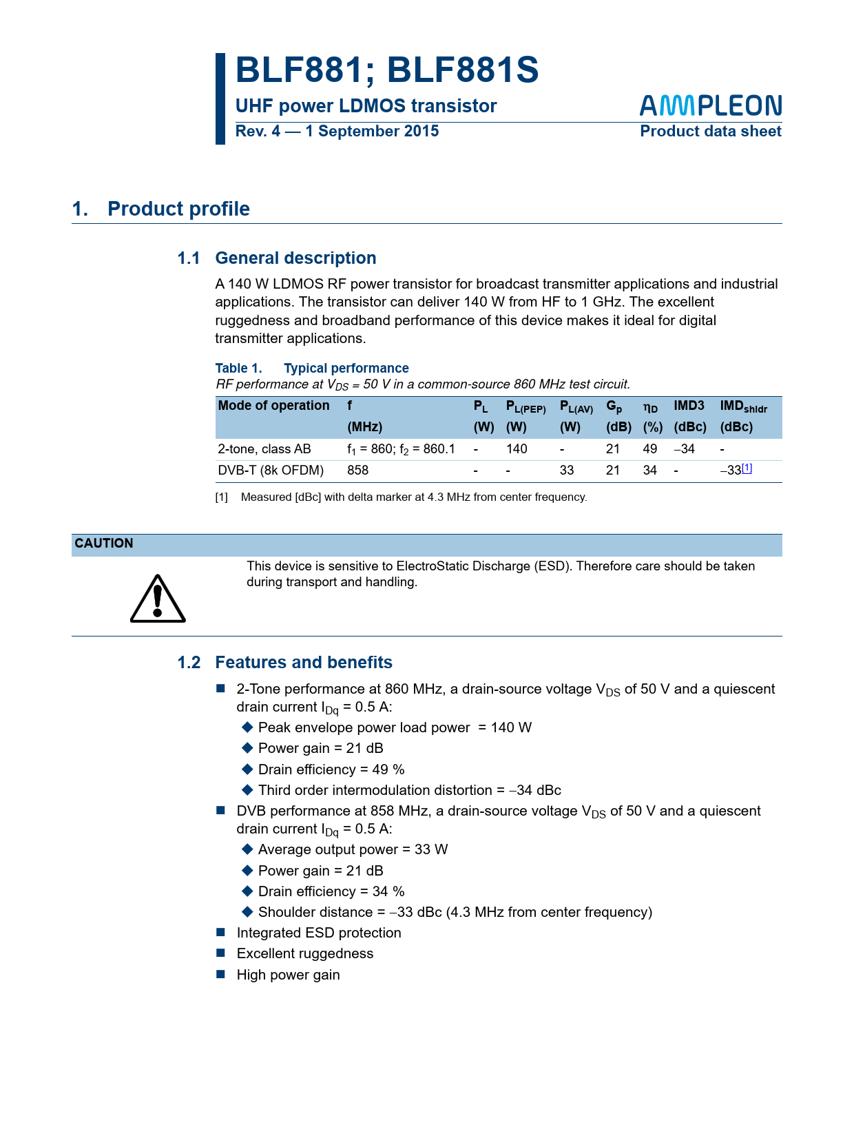 link to page 1 BLF881; BLF881S UHF power LDMOS transistor Rev. 4 — 1 September 2015Product data sheet1. Product profile1.1 General description A 140 W LDMOS RF power transistor for broadcast transmitter applications and industrial applications. The transistor can deliver 140 W from HF to 1 GHz. The excellent ruggedness and broadband performance of this device makes it ideal for digital transmitter applications. Table 1.Typical performance RF performance at VDS = 50 V in a common-source 860 MHz test circuit. Mode of operationfPLPL(PEP) PL(AV) Gp D IMD3 IMDshldr(MHz)(W) (W)(W)(dB) (%) (dBc) (dBc) 2-tone, class AB f1 = 860; f2 = 860.1 - 140 - 21 49 34 - DVB-T (8k OFDM) 858 - - 33 21 34 - 33[1] [1] Measured [dBc] with delta marker at 4.3 MHz from center frequency. CAUTION This device is sensitive to ElectroStatic Discharge (ESD). Therefore care should be taken during transport and handling. 1.2 Features and benefits 2-Tone performance at 860 MHz, a drain-source voltage VDS of 50 V and a quiescent drain current IDq = 0.5 A: Peak envelope power load power = 140 W Power gain = 21 dB Drain efficiency = 49 % Third order intermodulation distortion = 34 dBc DVB performance at 858 MHz, a drain-source voltage VDS of 50 V and a quiescent drain current IDq = 0.5 A: Average output power = 33 W Power gain = 21 dB Drain efficiency = 34 % Shoulder distance = 33 dBc (4.3 MHz from center frequency) Integrated ESD protection Excellent ruggedness High power gain Document Outline 1. Product profile 1.1 General description 1.2 Features and benefits 1.3 Applications 2. Pinning information 3. Ordering information 4. Limiting values 5. Thermal characteristics 6. Characteristics 7. Application information 7.1 Narrowband RF figures 7.1.1 CW 7.1.2 2-Tone 7.1.3 DVB-T 7.2 Broadband RF figures 7.2.1 DVB-T 7.3 Ruggedness in class-AB operation 7.4 Reliability 8. Test information 9. Package outline 10. Abbreviations 11. Revision history 12. Legal information 12.1 Data sheet status 12.2 Definitions 12.3 Disclaimers 12.4 Licenses 12.5 Trademarks 13. Contact information 14. Contents