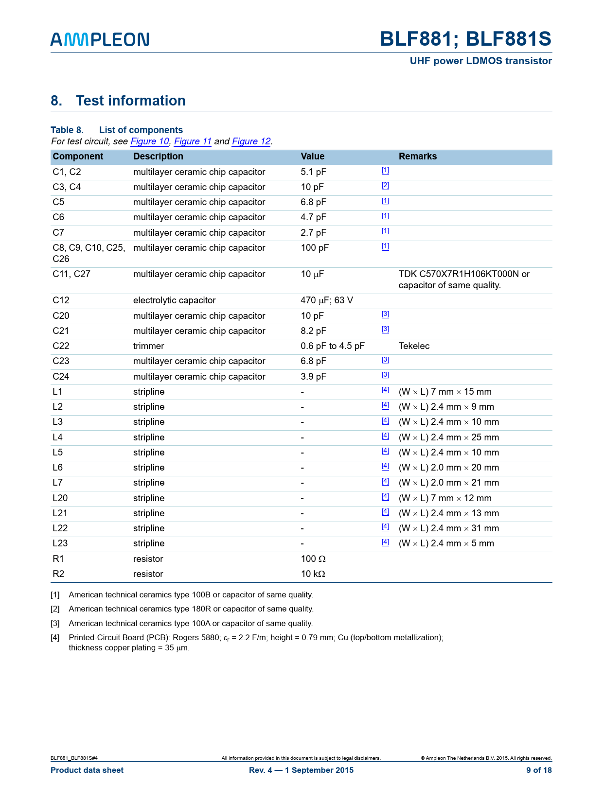 BLF881; BLF881S. UHF power LDMOS transistor. 8. Test information. Table 8. List of components. Component. Description. Value. Remarks