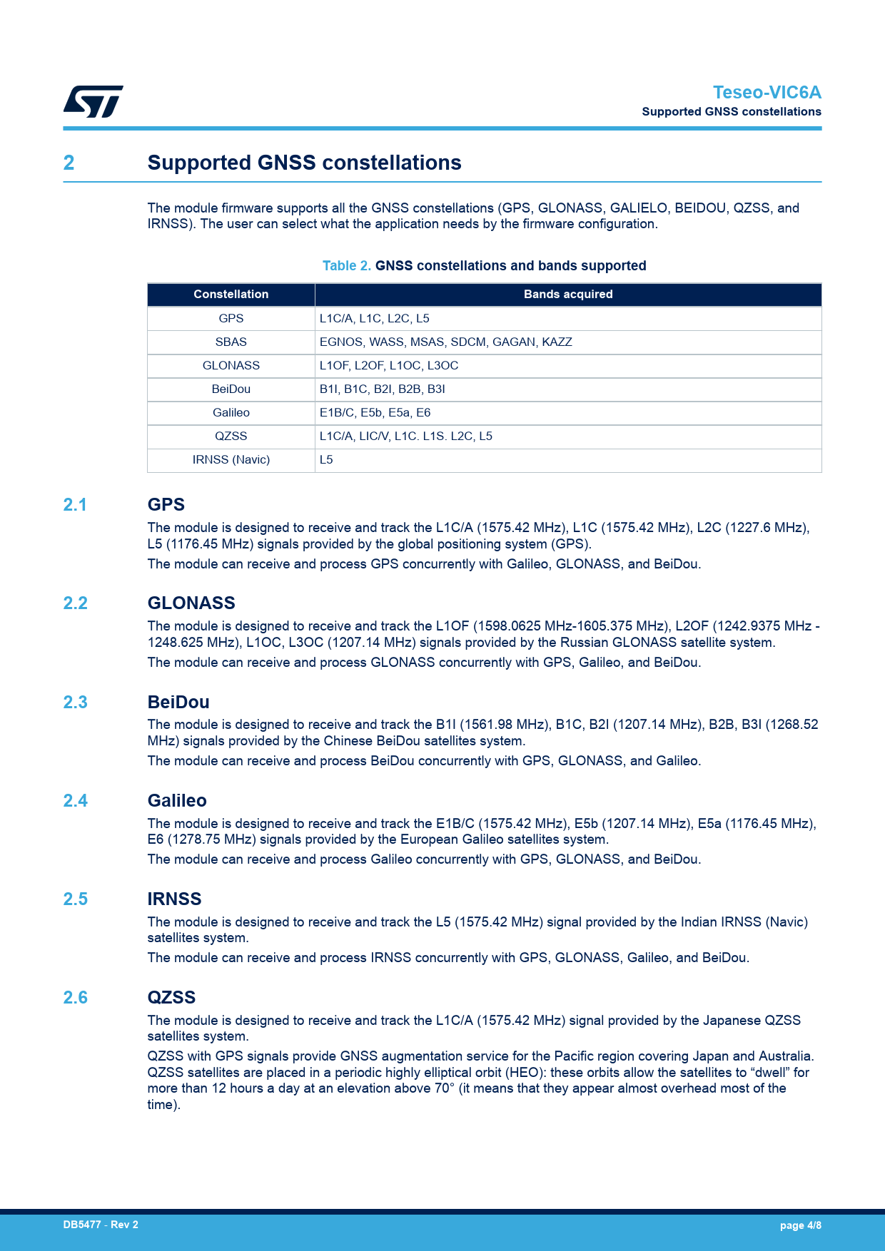 Teseo-VIC6ASupported GNSS constellations2Supported GNSS constellations The module firmware supports all the GNSS constellations (GPS, GLONASS, GALIELO, BEIDOU, QZSS, and IRNSS). The user can select what the application needs by the firmware configuration. Table 2. GNSS constellations and bands supportedConstellationBands acquired GPS L1C/A, L1C, L2C, L5 SBAS EGNOS, WASS, MSAS, SDCM, GAGAN, KAZZ GLONASS L1OF, L2OF, L1OC, L3OC BeiDou B1I, B1C, B2I, B2B, B3I Galileo E1B/C, E5b, E5a, E6 QZSS L1C/A, LIC/V, L1C. L1S. L2C, L5 IRNSS (Navic) L5 2.1GPS The module is designed to receive and track the L1C/A (1575.42 MHz), L1C (1575.42 MHz), L2C (1227.6 MHz), L5 (1176.45 MHz) signals provided by the global positioning system (GPS). The module can receive and process GPS concurrently with Galileo, GLONASS, and BeiDou. 2.2GLONASS The module is designed to receive and track the L1OF (1598.0625 MHz-1605.375 MHz), L2OF (1242.9375 MHz - 1248.625 MHz), L1OC, L3OC (1207.14 MHz) signals provided by the Russian GLONASS satellite system. The module can receive and process GLONASS concurrently with GPS, Galileo, and BeiDou. 2.3BeiDou The module is designed to receive and track the B1I (1561.98 MHz), B1C, B2I (1207.14 MHz), B2B, B3I (1268.52 MHz) signals provided by the Chinese BeiDou satellites system. The module can receive and process BeiDou concurrently with GPS, GLONASS, and Galileo. 2.4Galileo The module is designed to receive and track the E1B/C (1575.42 MHz), E5b (1207.14 MHz), E5a (1176.45 MHz), E6 (1278.75 MHz) signals provided by the European Galileo satellites system. The module can receive and process Galileo concurrently with GPS, GLONASS, and BeiDou. 2.5IRNSS The module is designed to receive and track the L5 (1575.42 MHz) signal provided by the Indian IRNSS (Navic) satellites system. The module can receive and process IRNSS concurrently with GPS, GLONASS, Galileo, and BeiDou. 2.6QZSS The module is designed to receive and track the L1C/A (1575.42 MHz) signal provided by the Japanese QZSS satellites system. QZSS with GPS signals provide GNSS augmentation service for the Pacific region covering Japan and Australia. QZSS satellites are placed in a periodic highly elliptical orbit (HEO): these orbits allow the satellites to “dwell” for more than 12 hours a day at an elevation above 70° (it means that they appear almost overhead most of the time). DB5477 - Rev 2page 4/8 Document Outline Teseo-VIC6A 1 Module description 1.1 Block diagram 1.2 Pin configuration 1.3 Pin out description 2 Supported GNSS constellations 2.1 GPS 2.2 GLONASS 2.3 BeiDou 2.4 Galileo 2.5 IRNSS 2.6 QZSS 3 Augmentation systems 3.1 Satellite-based augmentation system 3.2 Differential GPS Revision history