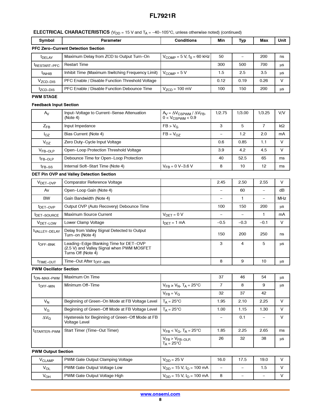页数 / 页21 / 8 — FL7921R. ELECTRICAL CHARACTERISTICS. Symbol. Parameter. Conditions. Min. …