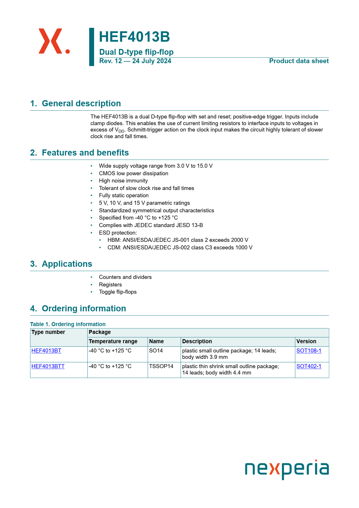 页数 / 页14 / 1 — HEF4013B. Dual D-type flip-flop. Rev. 12 — 24 July 2024. Product data …