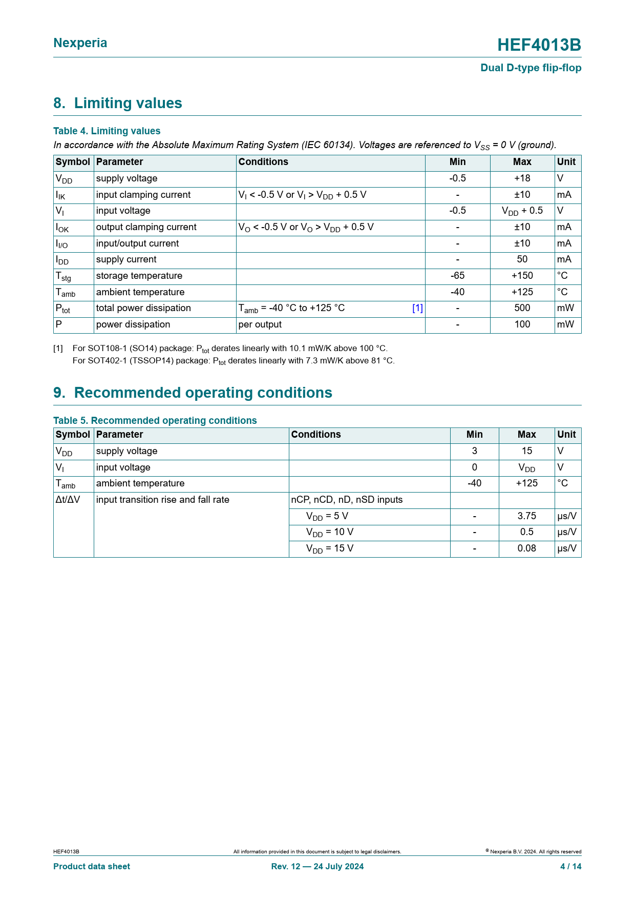 | 页数 / 页 | 14 / 4 — Nexperia. HEF4013B. Dual D-type flip-flop. 8. Limiting values Table 4. … |