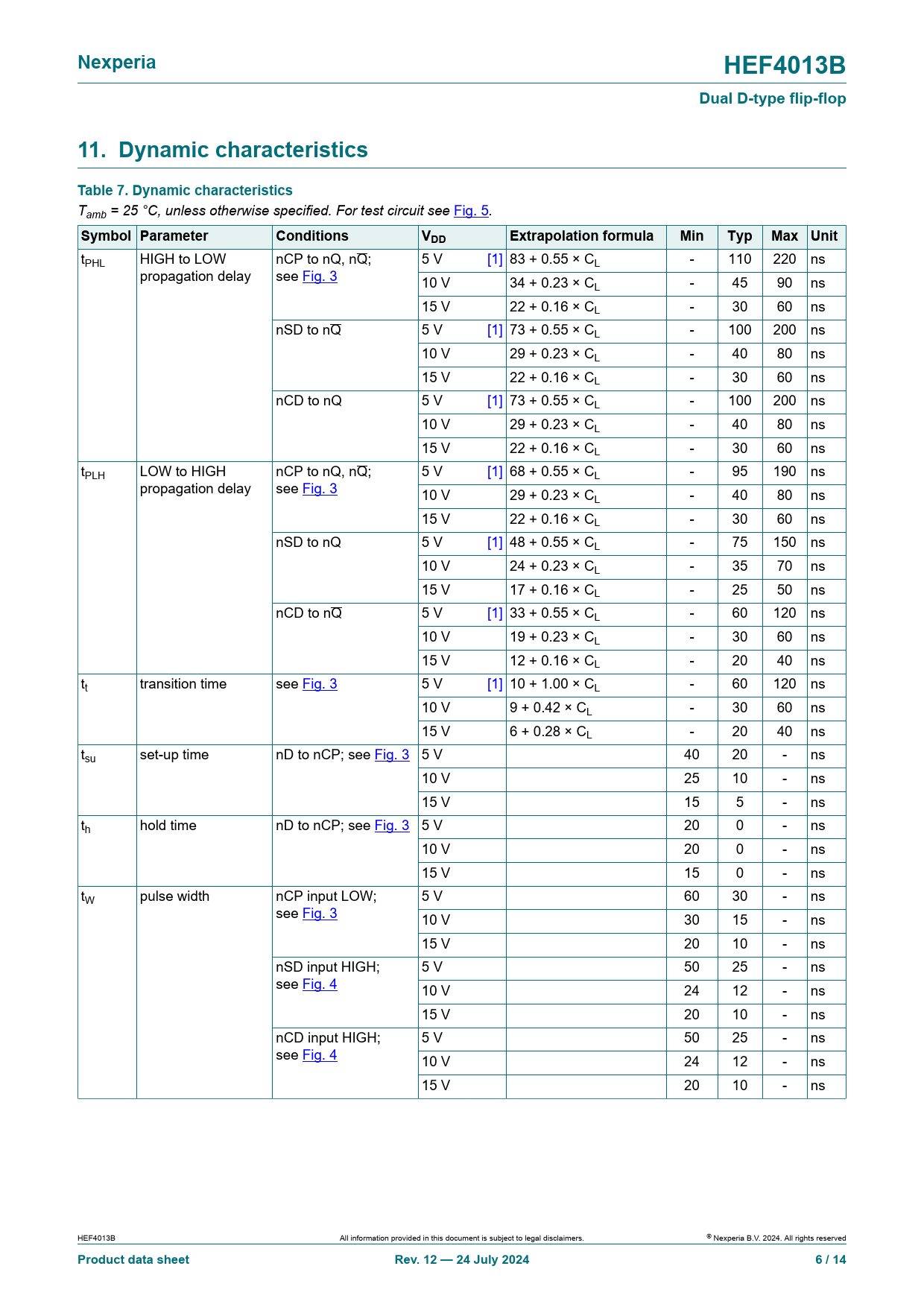 Nexperia HEF4013B Dual D-type flip-flop 11. Dynamic characteristics Table 7. Dynamic characteristics