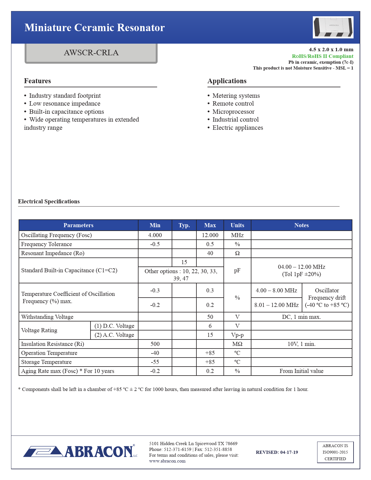Miniature Ceramic Resonator4.5 x 2.0 x 1.0 mm AWSCR-CRLA RoHS/RoHS II CompliantPb in ceramic, exemption (7c-I)This product is not Moisture Sensitive - MSL = 1FeaturesApplications• Industry standard footprint • Metering systems • Low resonance impedance • Remote control • Built-in capacitance options • Microprocessor • Wide operating temperatures in extended • Industrial control industry range • Electric appliances Electrical SpecificationsParametersMinTyp.MaxUnitsNotes Oscillating Frequency (Fosc) 4.000 12.000 MHz Frequency Tolerance -0.5 0.5 % Resonant Impedance (Ro) 40 Ω 15 Standard Built-in Capacitance (C1=C2) Other options : 10, 22, 30, 33, pF 04.00 – 12.00 MHz (Tol 1pF ±20%) 39, 47 Temperature Coefficient of Oscillation -0.3 0.3 4.00 – 8.00 MHz Oscillator Frequency (%) max. % Frequency drift -0.2 0.2 8.01 – 12.00 MHz (-40 ºC to +85 ºC) Withstanding Voltage 50 V DC, 1 min max. (1) D.C. Voltage 6 V Voltage Rating (2) A.C. Voltage 15 Vp-p Insulation Resistance (Ri) 500 MΩ 10V, 1 min. Operation Temperature -40 +85 ºC Storage Temperature -55 +85 ºC Aging Rate max (Fosc) * For 10 years -0.2 0.2 % From Initial value * Components shall be left in a chamber of +85 oC ± 2 oC for 1000 hours, then measured after leaving in natural condition for 1 hour. 5101 Hidden Creek Ln Spicewood TX 78669 ABRACON IS Phone: 512-371-6159 | Fax: 512-351-8858 REVISED: 04-17-19 ISO9001-2015 LLC For terms and conditions of sales, please visit: CERTIFIED www.abracon.com