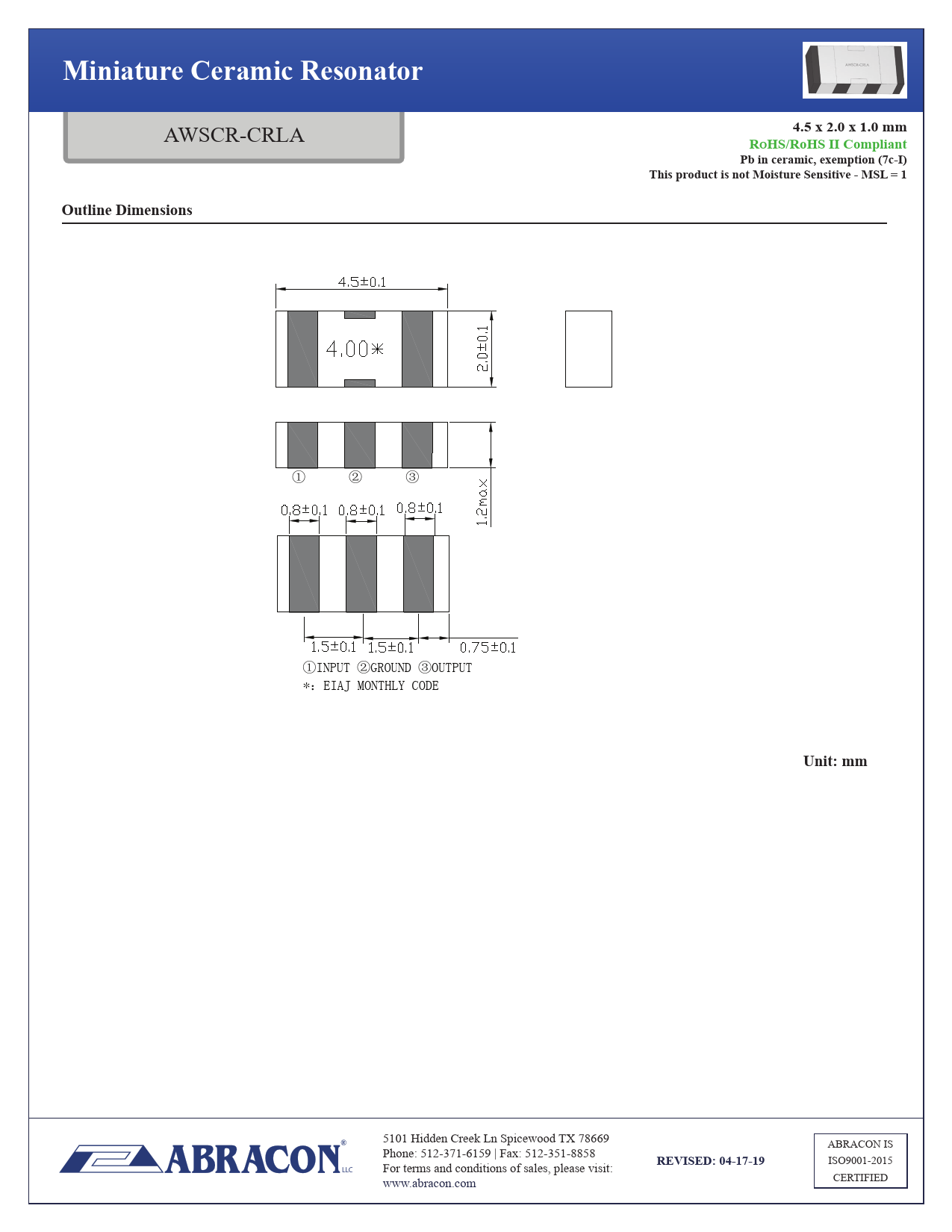 Miniature Ceramic Resonator. 4.5 x 2.0 x 1.0 mm. RoHS/RoHS II Compliant. Pb in ceramic, exemption (7c-I)