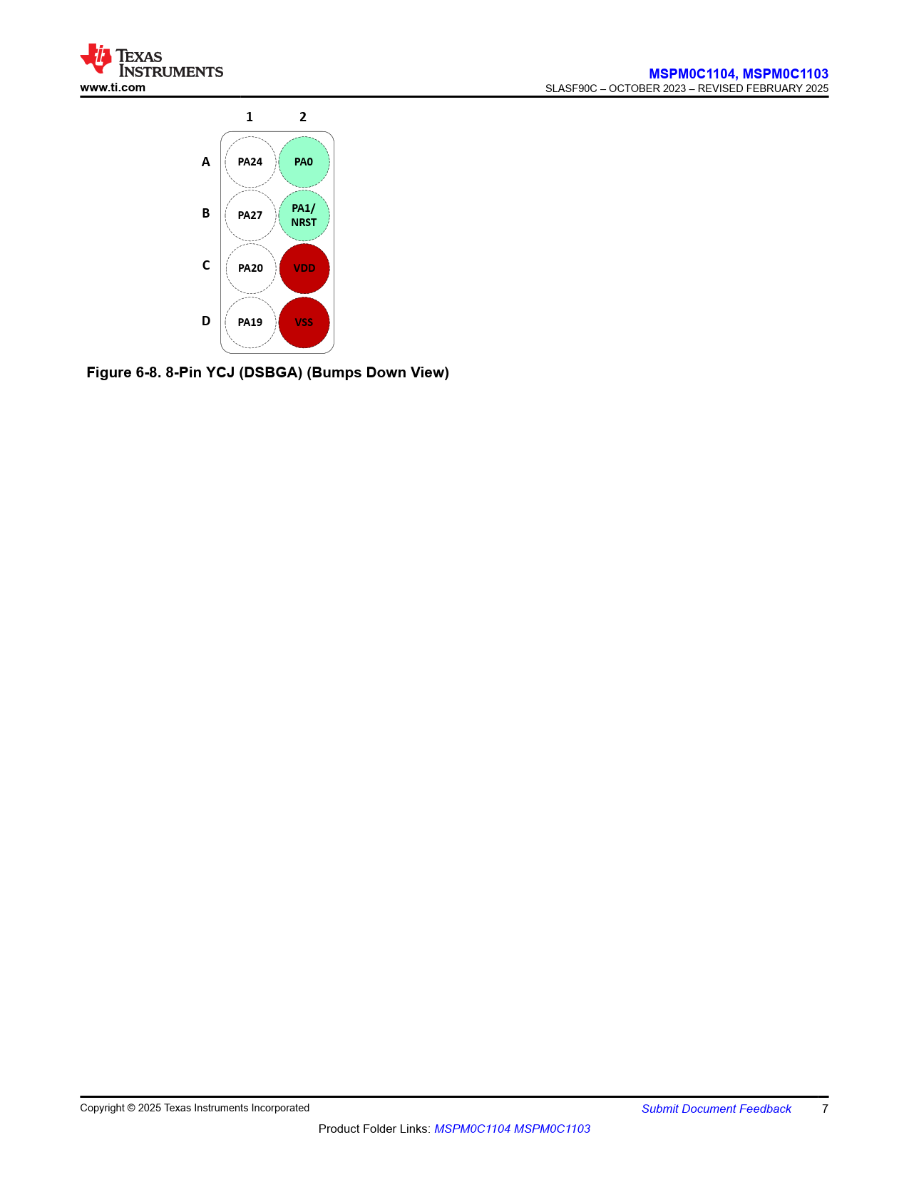 MSPM0C1104. , MSPM0C1103. www.ti.com. PA24. PA0. PA1/. PA27. NRST. PA20. VDD. PA19. VSS. Figure 6-8. 8-Pin YCJ (DSBGA) (Bumps Down View)