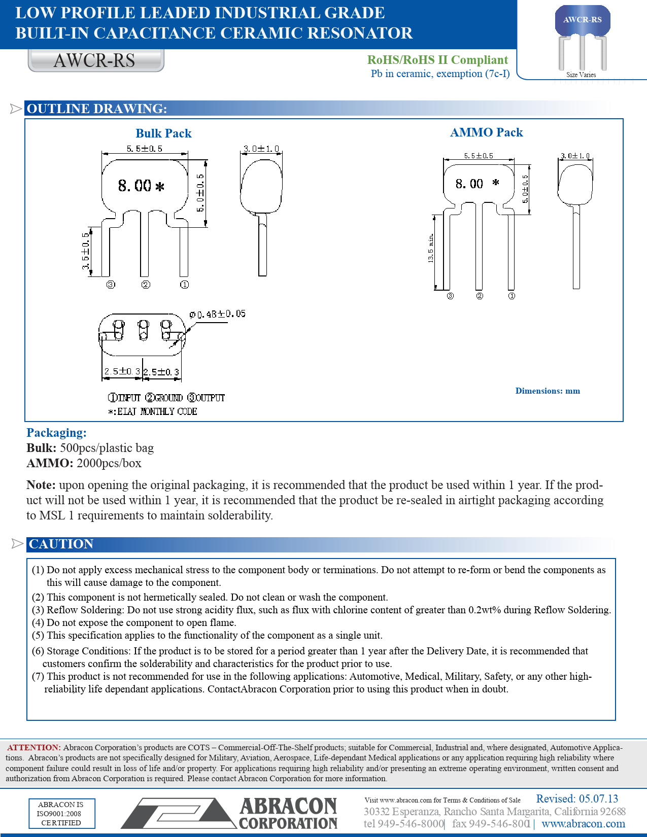 L LOWOW PR PO RFIAW OLC FER-ILLEEARS S LDer EE ADies DEDLOW PROFILE LEADED INDUSTRIAININD DUSUSTLTRI RIALOW AGP LRR OGAF RDEILE LEADEDINDUSTRIAL GR AB DE BUILT-INLUILT- GRADEINAWCR-RSBUILT-IN CAADE BUILT-INPC ACICA APAC TPCIAPANCE CERAMIC RACTA IACTNI AT NANCE CECE CERAMCE CE RRAAIC MMIC EIC SONATORRESONATORRESONATOR July 19th AWCR-RS RESONATOR , 2012 5.5 x 3.0 x 5.0mmRoHS/RoHS II Compliant ssue: July 19th, 2012 5.5 x 3.0 x 5.0mm Pb in ceramic, exemption (7c-I) Size Varies uly 19th, 2012 5.5 x 3.0 x 5.0mm | | | | | | | | | | | | | | | ) of (10) Abracon Drawing # 452751 Revision #: C of Pag e( 10 (6) of (10) Abracon Draw ing # 452751 Revision #: C OUTLINE DRAWING: ) Abracon Drawing # 452751 Revision #: C mensionsne DimensionsBulk PackmensionsAMMO PackAM AM MO MP Oac Pk: a ck::AM MO Pack:Pack:Dimensions: mmPackaging:Bulk: 500pcs/plastic bag AMMO: 2000pcs/box Note: upon opening the original packaging, it is recommended that the product be used within 1 year. If the prod- Dimension: mm uct will not be used within 1 year Dimension: mm , it is recommended that the product be re-sealed in airtight packaging according to MSL Dimension: m 1 requirements to maintain solderabilit m y. CAUTION (1) Do not apply excess mechanical stress to the component body or terminations. Do not attempt to re-form or bend the components as this will cause damage to the component. (2) This component is not hermetically sealed. Do not clean or wash the component. (3) Reflow Soldering: Do not use strong acidity flux, such as flux with chlorine content of greater than 0.2wt% during Reflow Soldering. (4) Do not expose the component to open flame. (5) This specification applies to the functionality of the component as a single unit. (6) Storage Conditions: If the product is to be stored for a period greater than 1 year after the Delivery Date, it is recommended that customers confirm the solderability and characteristics for the product prior to use. (7) This product is not recommended for use in the following applications: Automotive, Medical, Military, Safety, or any other high- reliabilit , y life dependant applications. ContactAbracon Corporation p rior to using this product when in doubt. mmATTENTION: Abracon Corporation’s products are COTS – Commercial-Off-The-Shelf products; suitable for Commercial, Industrial and, where designated, Automotive Applica- tions. Abracon’s products are not specifically designed for Military, Aviation, Aerospace, Life-dependant Medical applications or any application requiring high reliability where component failure could result in loss of life and/or property. For applications requiring high reliability and/or presenting an extreme operating environment, written consent and authorization from Abracon Corporation is required. Please contact Abracon Corporation for more information. Visit www.abracon.com for Terms & Conditions of Sale Revised: 05.07.13 ABRACON IS ISO9001:2008 30332 Esperanza, Rancho Santa Margarita, California 92688 CERTIFIED tel 949-546-8000 | fax 949-546-8001| www.abracon.com