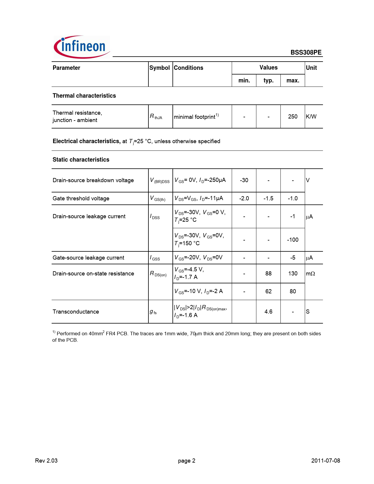 BSS308PEParameterSymbol ConditionsValuesUnitmin.typ.max.Thermal characteristics Thermal resistance, R junction - ambient thJA minimal footprint1) - - 250 K/W Electrical characteristics, at T j=25 °C, unless otherwise specified Static characteristics Drain-source breakdown voltage V (BR)DSS V GS= 0V, I D=-250µA -30 - - V Gate threshold voltage V GS(th) V DS=VGS, I D=-11µA -2.0 -1.5 -1.0 V Drain-source leakage current DS=-30V, V GS=0 V, I DSS - - -1 μA T j=25 °C V DS=-30V, V GS=0V, - - -100 T j=150 °C Gate-source leakage current I GSS V GS=-20V, V DS=0V - - -5 μA V Drain-source on-state resistance GS=-4.5 V, R DS(on) - 88 130 mΩ I D=-1.7 A V GS=-10 V, I D=-2 A - 62 80 |V Transconductance DS|>2|I D|R DS(on)max, g fs 4.6 - S I D=-1.6 A 1) Performed on 40mm2 FR4 PCB. The traces are 1mm wide, 70μm thick and 20mm long; they are present on both sides of the PCB. Rev 2.03 page 2 2011-07-08
