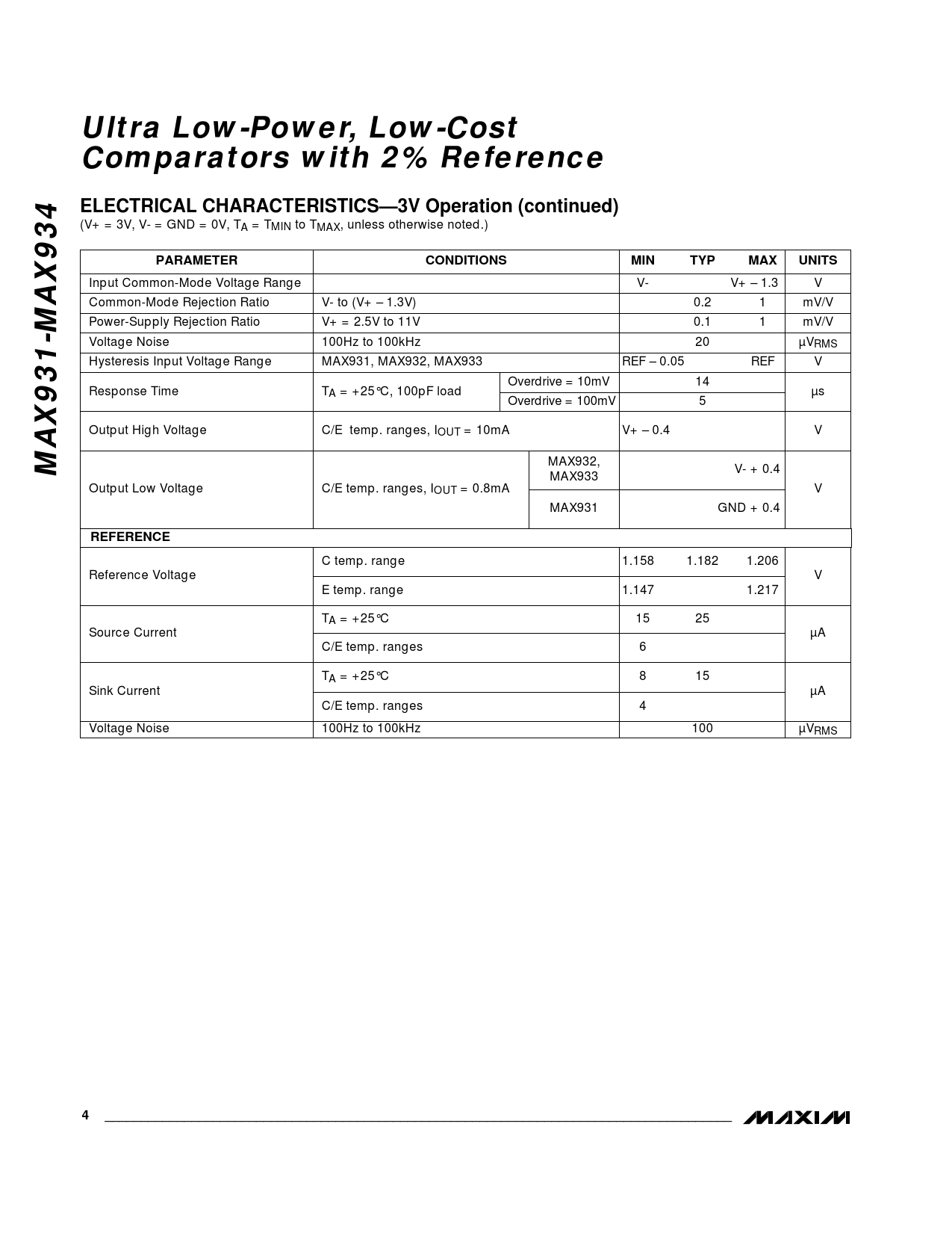 Ultra Low-Power, Low-Cost Comparators with 2% ReferenceELECTRICAL CHARACTERISTICS—3V Operation (continued) (V+ = 3V, V- = GND = 0V, TA = TMIN to TMAX, unless otherwise noted.) PARAMETERCONDITIONSMIN TYP MAXUNITS Input Common-Mode Voltage Range V- V+ – 1.3 V Common-Mode Rejection Ratio V- to (V+ – 1.3V) 0.2 1 mV/V Power-Supply Rejection Ratio V+ = 2.5V to 11V 0.1 1 mV/V Voltage Noise 100Hz to 100kHz 20 µVRMS Hysteresis Input Voltage Range MAX931, MAX932, MAX933 REF – 0.05 REF V Overdrive = 10mV 14 Response Time TA = +25°C, 100pF load µs Overdrive = 100mV 5 Output High Voltage C/E temp. ranges, IOUT = 10mA V+ – 0.4 V MAX931-MAX934 MAX932, V- + 0.4 MAX933 Output Low Voltage C/E temp. ranges, IOUT = 0.8mA V MAX931 GND + 0.4 REFERENCE C temp. range 1.158 1.182 1.206 Reference Voltage V E temp. range 1.147 1.217 TA = +25°C 15 25 Source Current µA C/E temp. ranges 6 TA = +25°C 8 15 Sink Current µA C/E temp. ranges 4 Voltage Noise 100Hz to 100kHz 100 µVRMS 4_______________________________________________________________________________________