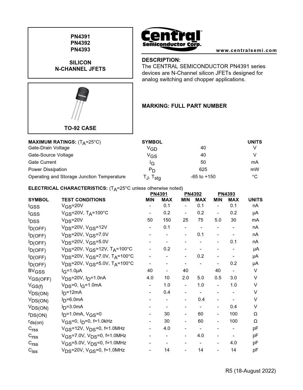PN4391. PN4392. PN4393. www.centra lsemi.com. SILICON. DESCRIPTION:. N-CHANNEL JFETS. MARKING: FULL PART NUMBER. TO-92 CASE