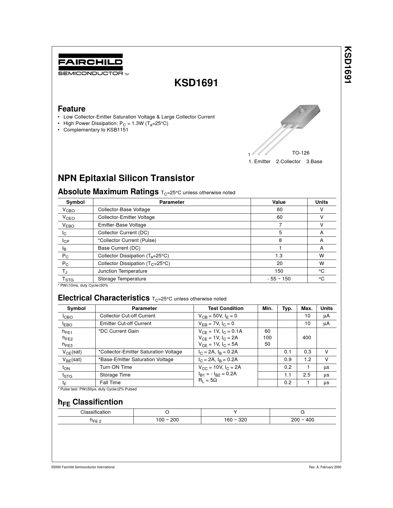 Classification O Y G hFE 2 100 ~ 200 160 ~ 320 200 ~ 400 ©2000 Fairchild Semiconductor International Rev. A, February 2000