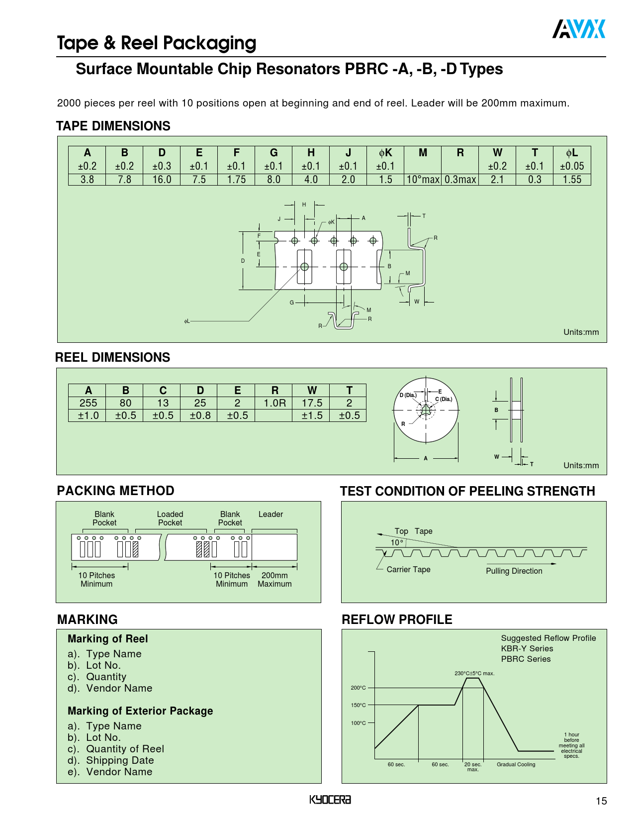 Tape & Reel Packaging. Surface Mountable Chip Resonators PBRC -A, -B, -D Types. TAPE DIMENSIONS. REEL DIMENSIONS. D (Dia.)
