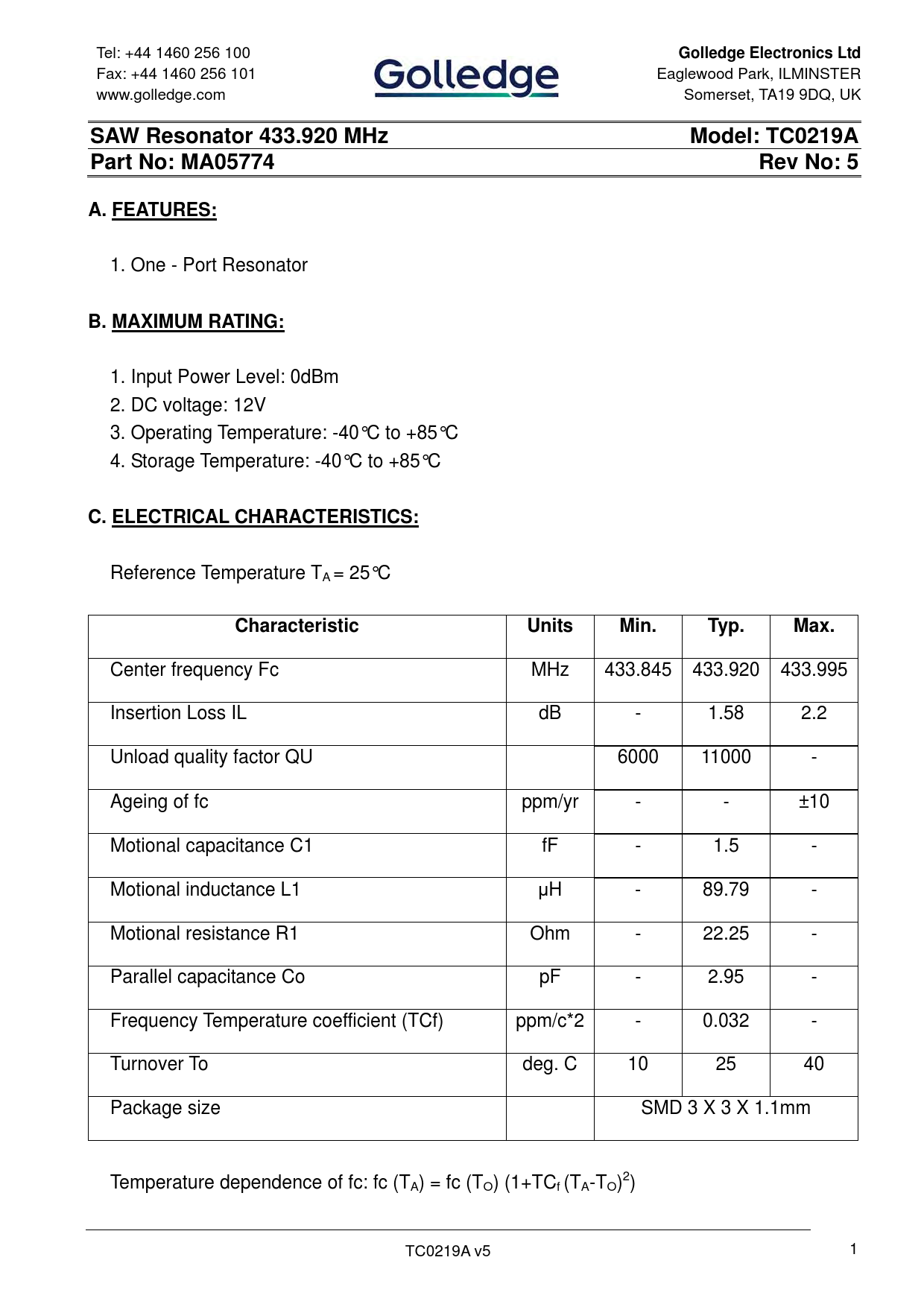 Golledge Electronics Ltd. SAW Resonator 433.920 MHz. Model: TC0219A. Part No: MA05774. Rev No: 5. A. FEATURES:. B. MAXIMUM RATING:
