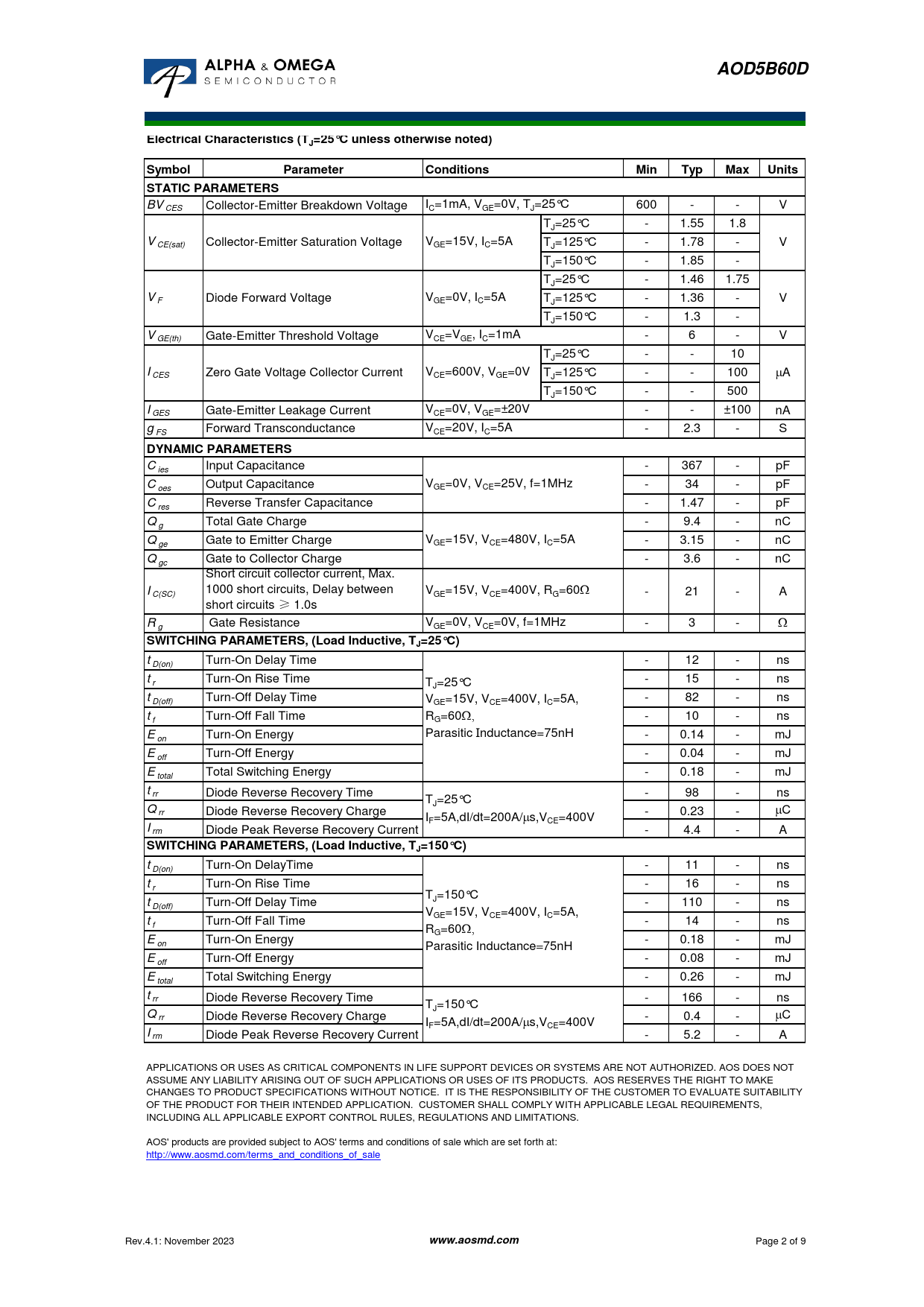t D(on) Turn-On DelayTime - 11 - ns t r Turn-On Rise Time - 16 - ns T t J=150° C D(off) Turn-Off Delay Time - 110 - ns VGE=15V, VCE=400V, IC=5A, t f Turn-Off Fall Time - 14 - ns RG=60W, E on Turn-On Energy - 0.18 - mJ Parasitic Inductance=75nH E off Turn-Off Energy - 0.08 - mJ E total Total Switching Energy - 0.26 - mJ t rr Diode Reverse Recovery Time - 166 - ns TJ=150°C Q rr Diode Reverse Recovery Charge - 0.4 - mC IF=5A,dI/dt=200A/ms,VCE=400V I rm Diode Peak Reverse Recovery Current - 5.2 - A APPLICATIONS OR USES AS CRITICAL COMPONENTS IN LIFE SUPPORT DEVICES OR SYSTEMS ARE NOT AUTHORIZED. AOS DOES NOT ASSUME ANY LIABILITY ARISING OUT OF SUCH APPLICATIONS OR USES OF ITS PRODUCTS. AOS RESERVES THE RIGHT TO MAKE CHANGES TO PRODUCT SPECIFICATIONS WITHOUT NOTICE. IT IS THE RESPONSIBILITY OF THE CUSTOMER TO EVALUATE SUITABILITY OF THE PRODUCT FOR THEIR INTENDED APPLICATION. CUSTOMER SHALL COMPLY WITH APPLICABLE LEGAL REQUIREMENTS, INCLUDING ALL APPLICABLE EXPORT CONTROL RULES, REGULATIONS AND LIMITATIONS. AOS' products are provided subject to AOS' terms and conditions of sale which are set forth at: http://www.aosmd.com/terms_and_conditions_of_sale Rev.4.1: November 2023