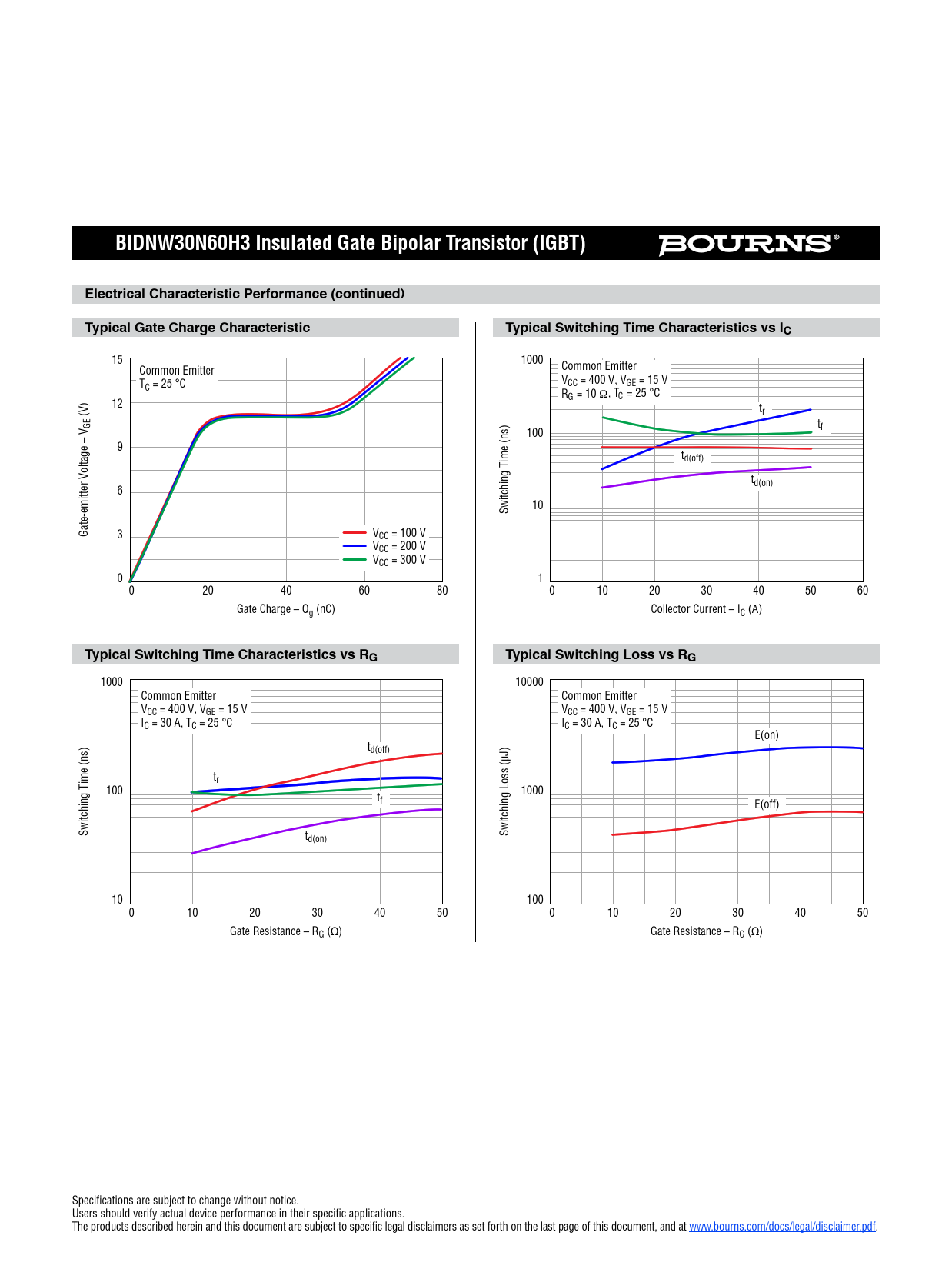 1000 10000 Common Emitter Common Emitter VCC = 400 V, VGE = 15 V VCC = 400 V, VGE = 15 V IC = 30 A, TC = 25 °C IC = 30 A, TC = 25 °C E(on) td(off) tr 100 1000 tf E(off) Switching Time (ns) Switching Loss (µJ) td(on) 10 100 0 10 20 30 40 50 0 10 20 30 40 50 Gate Resistance – RG (Ω) Gate Resistance – RG (Ω) Specifications are subject to change without notice. Users should verify actual device performance in their specific applications. The products described herein and this document are subject to specific legal disclaimers as set forth on the last page of this document, and at www.bourns.com/docs/legal/disclaimer.pdf.