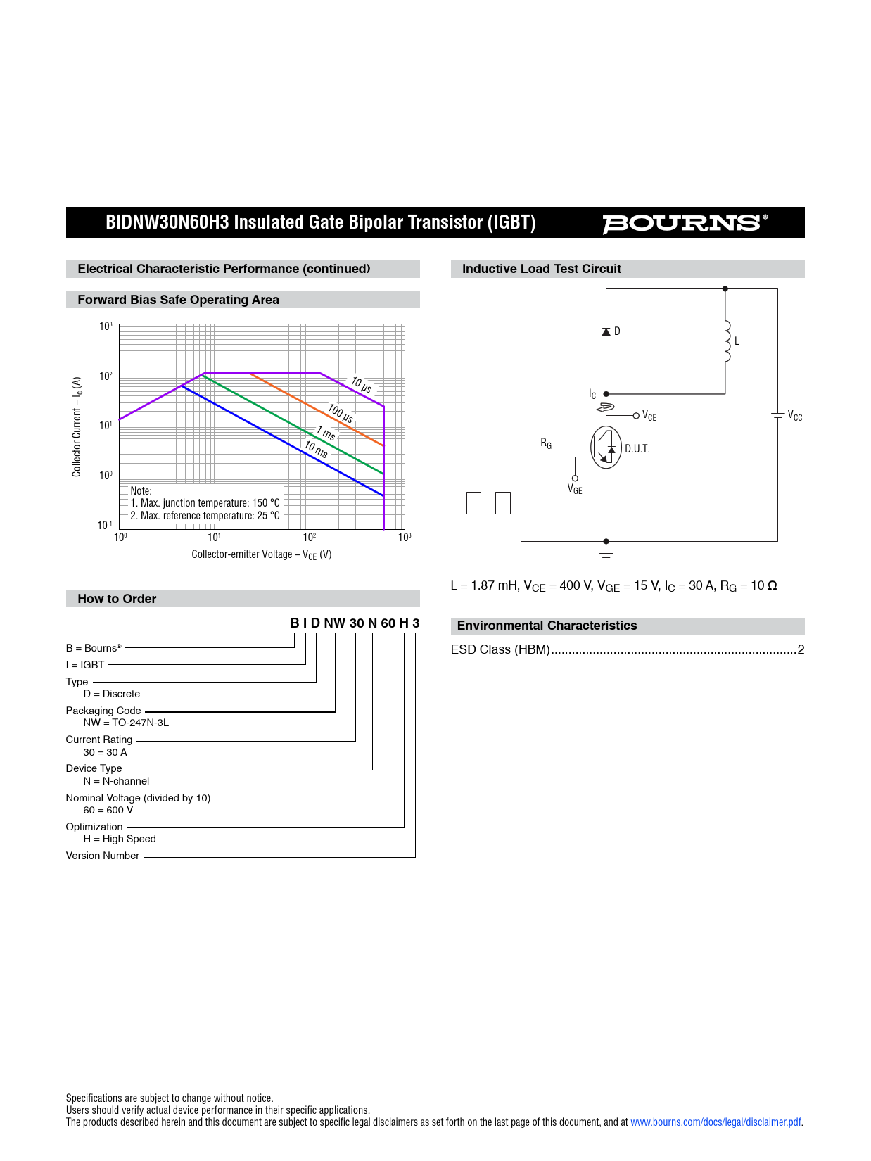 B = Bourns® ESD Class (HBM) ...2 I = IGBT Type D = Discrete Packaging Code NW = TO-247N-3L Current Rating 30 = 30 A Device Type N = N-channel Nominal Voltage (divided by 10) 60 = 600 V Optimization H = High Speed Version Number Specifications are subject to change without notice. Users should verify actual device performance in their specific applications. The products described herein and this document are subject to specific legal disclaimers as set forth on the last page of this document, and at www.bourns.com/docs/legal/disclaimer.pdf.