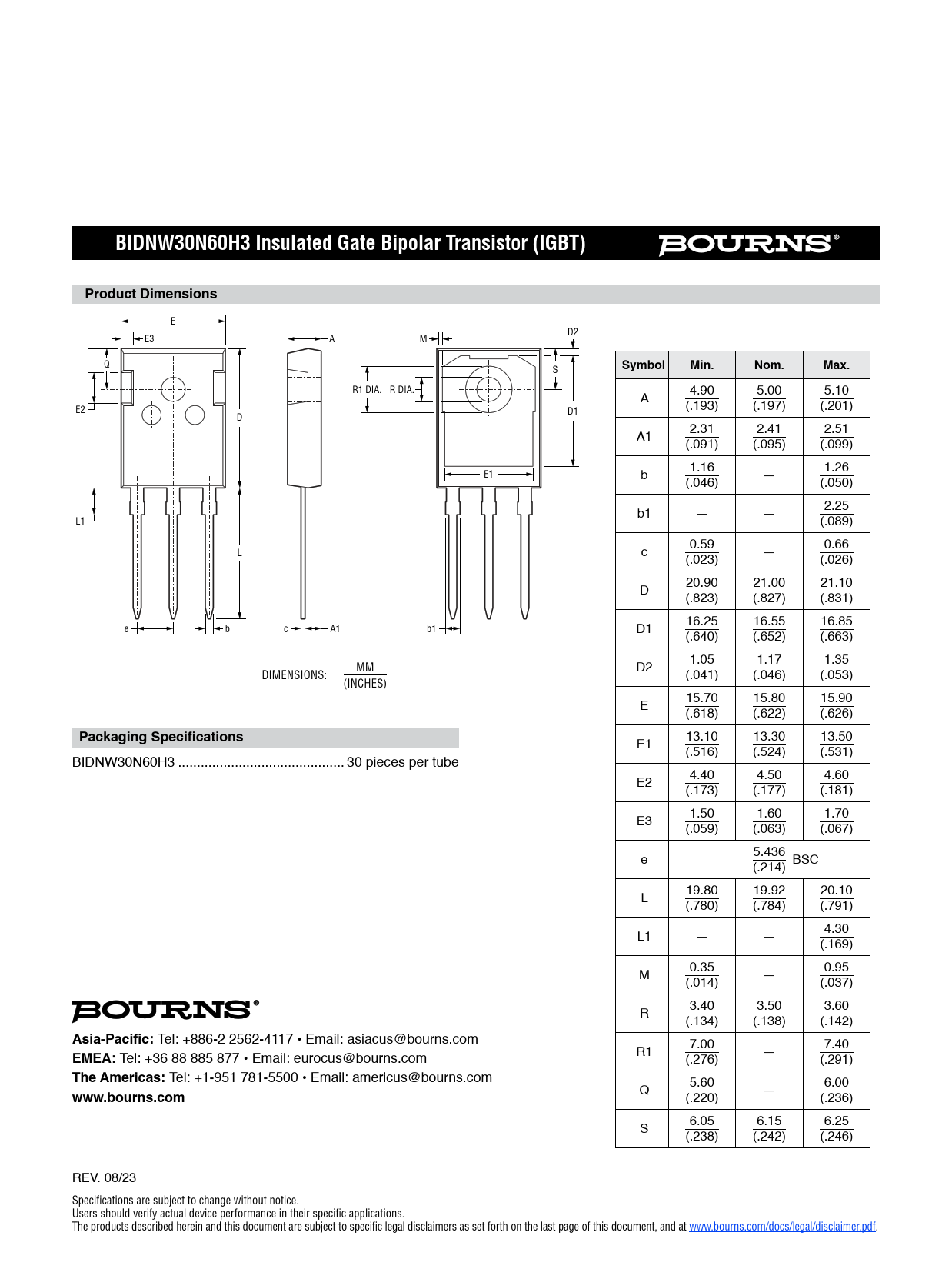 BIDNW30N60H3 Insulated Gate Bipolar Transistor (IGBT). Product Dimensions. Symbol. Min. Nom. Max. Packaging Specifications