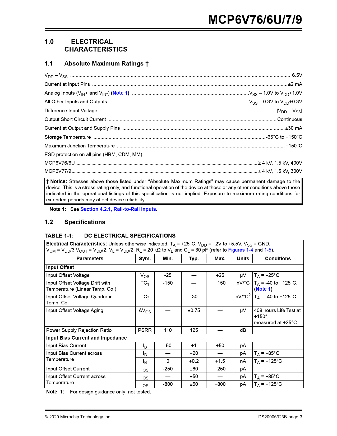 link to page 6 link to page 6 link to page 3 link to page 18 link to page 3 MCP6V76/6U/7/91.0ELECTRICALCHARACTERISTICS1.1Absolute Maximum Ratings † VDD – VSS ...6.5V Current at Input Pins ..±2 mA Analog Inputs (VIN+ and VIN-) (Note 1) ...VSS – 1.0V to VDD+1.0V All Other Inputs and Outputs ..VSS – 0.3V to VDD+0.3V Difference Input Voltage ...|VDD – VSS| Output Short Circuit Current ... Continuous Current at Output and Supply Pins ..±30 mA Storage Temperature ...-65°C to +150°C Maximum Junction Temperature .. +150°C ESD protection on all pins (HBM, CDM, MM) MCP6V76/6U 4 kV, 1.5 kV, 400V MCP6V77/9 4 kV, 1.5 kV, 300V † Notice: Stresses above those listed under “Absolute Maximum Ratings” may cause permanent damage to the device. This is a stress rating only, and functional operation of the device at those or any other conditions above those indicated in the operational listings of this specification is not implied. Exposure to maximum rating conditions for extended periods may affect device reliability. Note 1: See Section 4.2.1, Rail-to-Rail Inputs . 1.2SpecificationsTABLE 1-1:DC ELECTRICAL SPECIFICATIONSElectrical Characteristics: Unless otherwise indicated, TA = +25°C, VDD = +2V to +5.5V, VSS = GND, VCM = VDD/3,VOUT = VDD/2, VL = VDD/2, RL = 20 kΩ to VL and CL = 30 pF (refer to Figures 1-4 and 1-5). ParametersSym.Min.Typ.Max.UnitsConditionsInput Offset Input Offset Voltage VOS -25 — +25 µV TA = +25°C Input Offset Voltage Drift with TC1 -150 — +150 nV/°C TA = -40 to +125°C, Temperature (Linear Temp. Co.) (Note 1) Input Offset Voltage Quadratic TC2 — -30 — pV/°C2 TA = -40 to +125°C Temp. Co. Input Offset Voltage Aging ∆VOS — ±0.75 — µV 408 hours Life Test at +150°, measured at +25°C Power Supply Rejection Ratio PSRR 110 125 — dB Input Bias Current and Impedance Input Bias Current IB -50 ±1 +50 pA Input Bias Current across IB — +20 — pA TA = +85°C Temperature IB 0 +0.2 +1.5 nA TA = +125°C Input Offset Current IOS -250 ±60 +250 pA Input Offset Current across IOS — ±50 — pA TA = +85°C Temperature IOS -800 ±50 +800 pA TA = +125°C Note 1: For design guidance only; not tested. 2020 Microchip Technology Inc. DS20006323B-page 3 Document Outline 170 µA, 2 MHz Zero-Drift Op Amps Features Typical Applications Design Aids Related Parts Description Package Types Typical Application Circuit 1.0 Electrical Characteristics 1.1 Absolute Maximum Ratings 1.2 Specifications TABLE 1-1: DC Electrical Specifications TABLE 1-2: AC Electrical Specifications TABLE 1-3: Temperature Specifications 1.3 Timing Diagrams FIGURE 1-1: Amplifier Start Up. FIGURE 1-2: Offset Correction Settling Time. FIGURE 1-3: Output Overdrive Recovery. 1.4 Test Circuits FIGURE 1-4: AC and DC Test Circuit for Most Noninverting Gain Conditions. FIGURE 1-5: AC and DC Test Circuit for Most Inverting Gain Conditions. FIGURE 1-6: Test Circuit for Dynamic Input Behavior. 2.0 Typical Performance Curves 2.1 DC Input Precision FIGURE 2-1: Input Offset Voltage. FIGURE 2-2: Input Offset Voltage Drift. FIGURE 2-3: Input Offset Voltage Quadratic Temp. Co. FIGURE 2-4: Input Offset Voltage vs. Power Supply Voltage with VCM = VCML. FIGURE 2-5: Input Offset Voltage vs. Power Supply Voltage with VCM = VCMH. FIGURE 2-6: Input Offset Voltage vs. Output Voltage with VDD = 2.0V. FIGURE 2-7: Input Offset Voltage vs. Output Voltage with VDD = 5.5V. FIGURE 2-8: Input Offset Voltage vs. Common Mode Voltage with VDD = 2V. FIGURE 2-9: Input Offset Voltage vs. Common Mode Voltage with VDD = 5.5V. FIGURE 2-10: CMRR and PSRR vs. Ambient Temperature. FIGURE 2-11: DC Open-Loop Gain vs. Ambient Temperature. FIGURE 2-12: Input Bias and Offset Currents vs. Common Mode Input Voltage with TA = +85°C. FIGURE 2-13: Input Bias and Offset Currents vs. Common Mode Input Voltage with TA = +125°C. FIGURE 2-14: Input Bias and Offset Currents vs. Ambient Temperature with VDD = +5.5V. FIGURE 2-15: Input Bias Current vs. Input Voltage (below VSS). 2.2 Other DC Voltages and Currents FIGURE 2-16: Input Common Mode Voltage Headroom (Range) vs. Ambient Temperature. FIGURE 2-17: Output Voltage Headroom vs. Output Current. FIGURE 2-18: Output Voltage Headroom vs. Ambient Temperature. FIGURE 2-19: Output Short Circuit Current vs. Power Supply Voltage. FIGURE 2-20: Supply Current vs. Power Supply Voltage. FIGURE 2-21: Power-On Reset Voltage vs. Ambient Temperature. 2.3 Frequency Response FIGURE 2-22: CMRR and PSRR vs. Frequency. FIGURE 2-23: Open-Loop Gain vs. Frequency with VDD = 2V. FIGURE 2-24: Open-Loop Gain vs. Frequency with VDD = 5.5V. FIGURE 2-25: Gain Bandwidth Product and Phase Margin vs. Ambient Temperature. FIGURE 2-26: Gain Bandwidth Product and Phase Margin vs. Common Mode Input Voltage. FIGURE 2-27: Gain Bandwidth Product and Phase Margin vs. Output Voltage. FIGURE 2-28: Closed-Loop Output Impedance vs. Frequency with VDD = 2V. FIGURE 2-29: Closed-Loop Output Impedance vs. Frequency with VDD = 5.5V. FIGURE 2-30: Maximum Output Voltage Swing vs. Frequency. FIGURE 2-31: EMIRR vs Frequency. FIGURE 2-32: EMIRR vs RF Input Peak Voltage. FIGURE 2-33: Channel-to-Channel Separation vs. Frequency. 2.4 Input Noise and Distortion FIGURE 2-34: Input Noise Voltage Density and Integrated Input Noise Voltage vs. Frequency. FIGURE 2-35: Input Noise Voltage Density vs. Input Common Mode Voltage. FIGURE 2-36: Intermodulation Distortion vs. Frequency with VCM Disturbance (see Figure 1-6). FIGURE 2-37: Intermodulation Distortion vs. Frequency with VDD Disturbance (see Figure 1-6). FIGURE 2-38: Input Noise vs. Time with 1 Hz and 10 Hz Filters and VDD = 2V. FIGURE 2-39: Input Noise vs. Time with 1 Hz and 10 Hz Filters and VDD = 5.5V. 2.5 Time Response FIGURE 2-40: Input Offset Voltage vs. Time at Power-Up. FIGURE 2-41: The MCP6V76/6U/7/9 Family Shows No Input Phase Reversal with Overdrive. FIGURE 2-42: Noninverting Small Signal Step Response. FIGURE 2-43: Noninverting Large Signal Step Response. FIGURE 2-44: Inverting Small Signal Step R