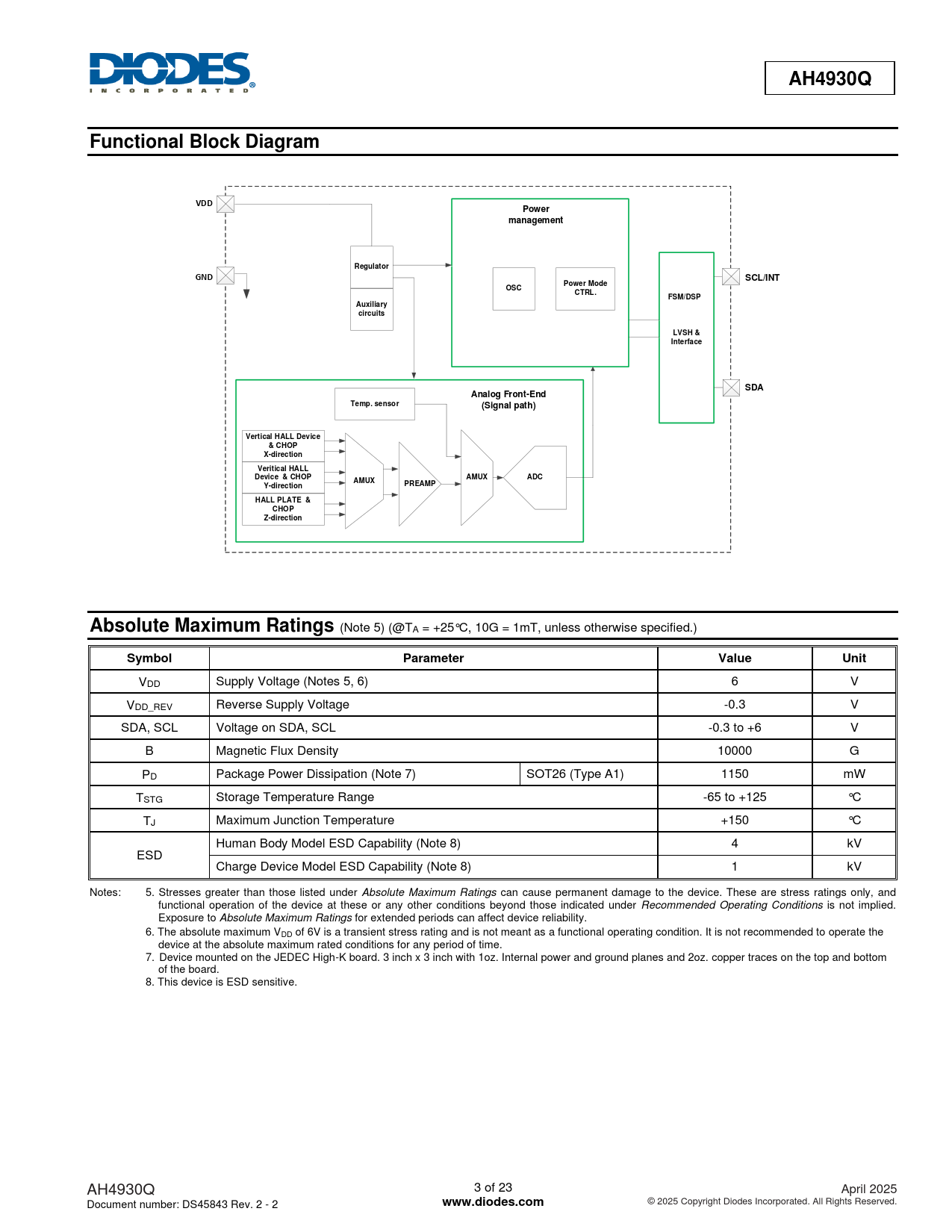 VDD Supply Voltage (Notes 5, 6) 6 V VDD_REV Reverse Supply Voltage -0.3 V SDA, SCL Voltage on SDA, SCL -0.3 to +6 V B Magnetic Flux Density 10000 G PD Package Power Dissipation (Note 7) SOT26 (Type A1) 1150 mW TSTG Storage Temperature Range -65 to +125 °C TJ Maximum Junction Temperature +150 °C Human Body Model ESD Capability (Note 8) 4 kV ESD Charge Device Model ESD Capability (Note 8) 1 kV Notes: 5. Stresses greater than those listed under Absolute Maximum Ratings can cause permanent damage to the device. These are stress ratings only, and functional operation of the device at these or any other conditions beyond those indicated under Recommended Operating Conditions is not implied. Exposure to Absolute Maximum Ratings for extended periods can affect device reliability. 6. The absolute maximum VDD of 6V is a transient stress rating and is not meant as a functional operating condition. It is not recommended to operate the device at the absolute maximum rated conditions for any period of time. 7. Device mounted on the JEDEC High-K board. 3 inch x 3 inch with 1oz. Internal power and ground planes and 2oz. copper traces on the top and bottom of the board. 8. This device is ESD sensitive. AH4930Q 3 of 23 April 2025 Document number: DS45843 Rev. 2 - 2