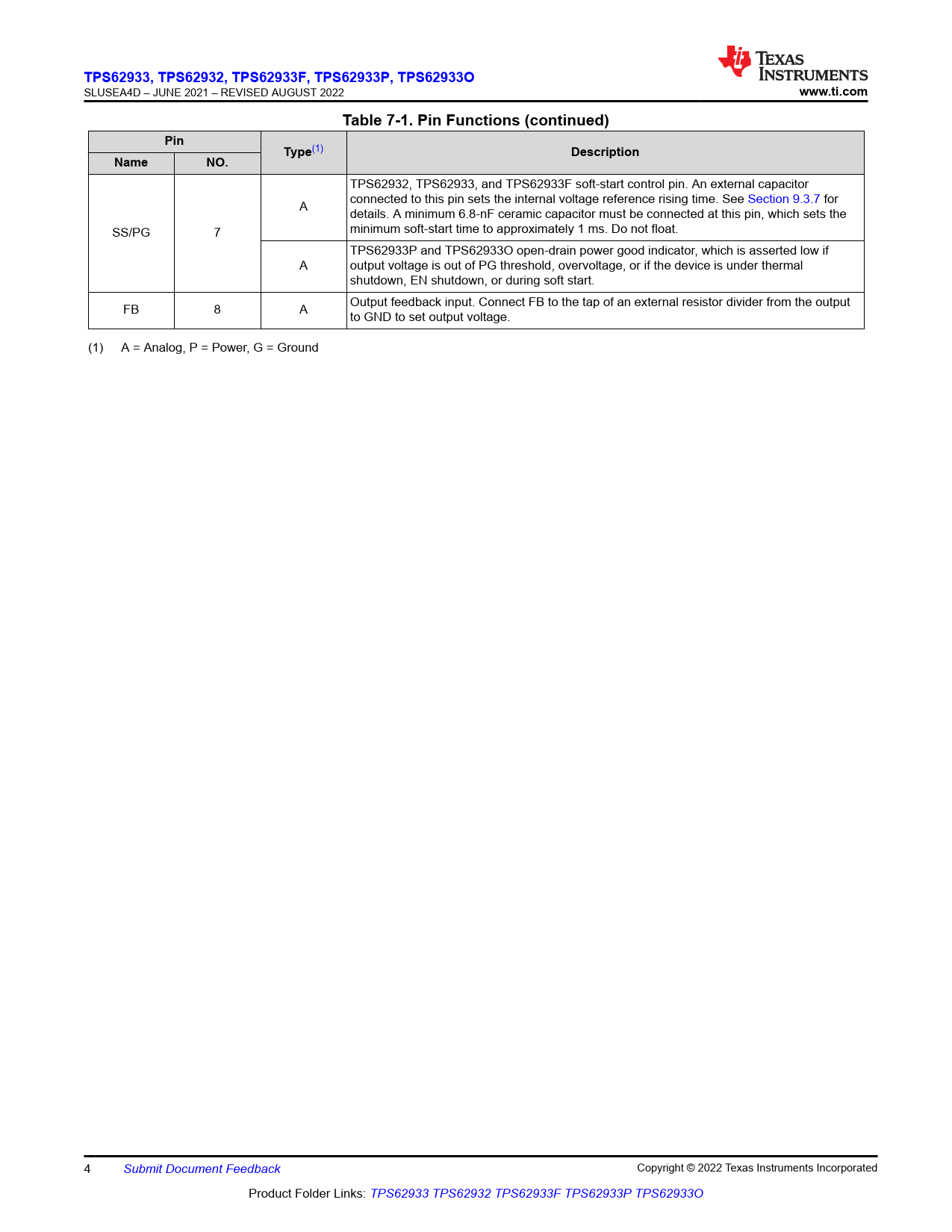 TPS62933,. TPS62932. , TPS62933F, TPS62933P, TPS62933O. www.ti.com. Table 7-1. Pin Functions (continued). Pin. Type. Description. Name
