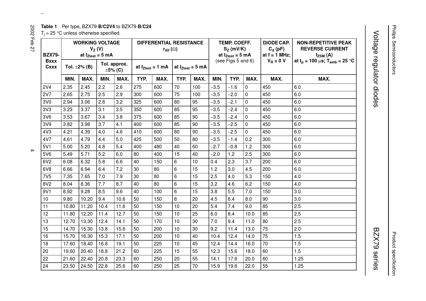 Table 1. B/C2V4. B/C24. WORKING VOLTAGE. DIFFERENTIAL RESISTANCE. TEMP. COEFF. DIODE CAP. NON-REPETITIVE PEAK. VZ (V). rdif (. SZ (mV/K)