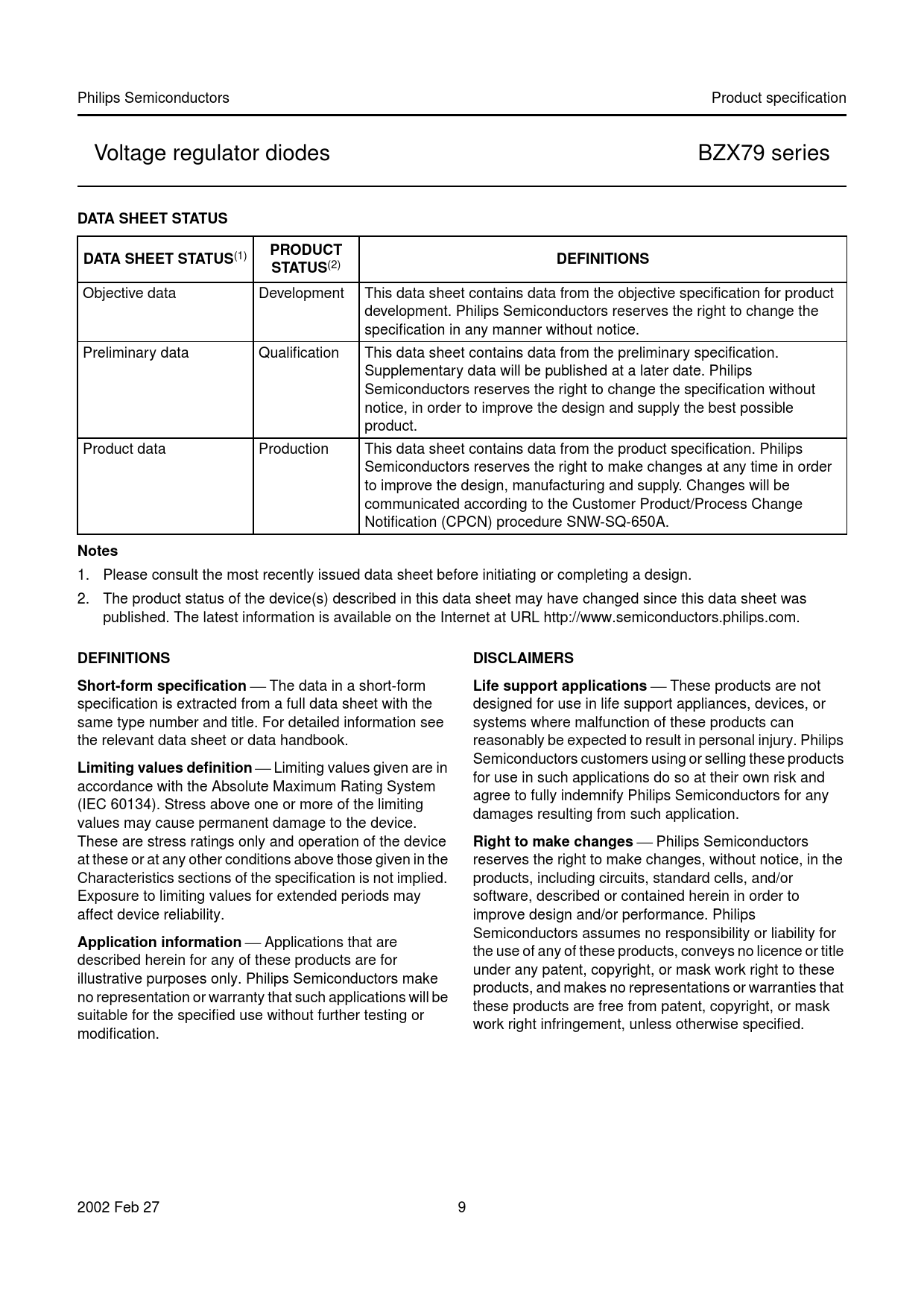 DATA SHEET STATUS. PRODUCT. DEFINITIONS. STATUS. Notes. DISCLAIMERS. Short-form specification. Life support applications