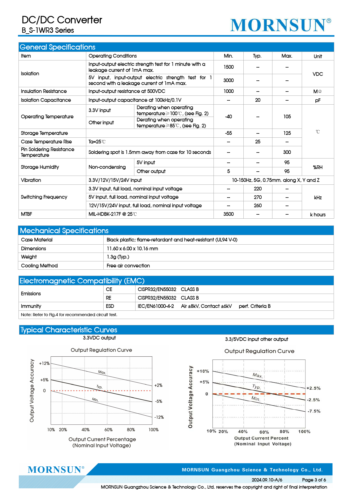 DC/DC Converter B_S-1WR3 SeriesGeneral SpecificationsItemOperating ConditionsMin.Typ.Max.UnitInput-output electric strength test for 1 minute with aleakage current of 1mA max.1500----IsolationVDC5V input, input-output electric strength test for 1second with a leakage current of 1mA max.3000----Insulation ResistanceInput-output resistance at 500VDC1000----M Ω Isolation CapacitanceInput-output capacitance at 100kHz/0.1V--20--pF3.3V inputDerating when operatingtemperatureOperating Temperature ≥ 100 ℃ , (see Fig. 2)-40--105Other inputDerating when operatingtemperature ≥ 85 ℃ , (see Fig. 2) ℃ Storage Temperature-55--125Case Temperature RiseTa=25 ℃ --25--Pin Soldering ResistanceTemperatureSoldering spot is 1.5mm away from case for 10 seconds----3005V input----95Storage HumidityNon-condensing%RHOther output5--95Vibration3.3V/12V/15V/24V input10-150Hz, 5G, 0.75mm. along X, Y and Z3.3V input, ful load, nominal input voltage--220--Switching Frequency5V input, ful load, nominal input voltage--270--kHz12V/15V/24V input, ful load, nominal input voltage--260--MTBFMIL-HDBK-217F @ 25 ℃ 3500----k hoursMechanical SpecificationsCase MaterialBlack plastic; flame-retardant and heat-resistant (UL94 V-0)Dimensions11.60 x 6.00 x 10.16 mmWeight1.3g (Typ.)Cooling MethodFree air convectionElectromagnetic Compatibility (EMC)CECISPR32/EN55032 CLASS BEmissionsRECISPR32/EN55032 CLASS BImmunityESDIEC/EN61000-4-2Air ±8kV, Contact ±6kVperf. Criteria BNote: Refer to Fig.4 for recommended circuit test.Typical Characteristic Curves3.3VDC output3.3/5VDC input other output2024.09.10-A/6Page 3 of 6MORNSUN Guangzhou Science & Technology Co., Ltd. reserves the copyright and right of final interpretation
