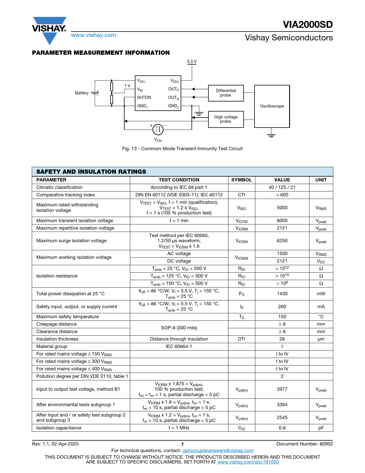 VIA2000SD www.vishay.com Vishay Semiconductors PARAMETER MEASUREMENT INFORMATION 3.3 V V V DD1 DD2 1 V V OUT IN P Differential Battery probe SHTDN OUTN GND GND 1 2 Oscilloscope High voltage probe VCM Fig. 13 - Common-Mode Transient Immunity Test Circuit SAFETY AND INSULATION RATINGS PARAMETERTEST CONDITIONSYMBOLVALUEUNIT Climatic classification According to IEC 68 part 1 40 / 125 / 21 Comparative tracking index DIN EN 60112 (VDE 0303-11); IEC 60112 CTI > 600 V Maximum rated withstanding TEST = VISO, t = 1 min (qualification); V V isolation voltage TEST = 1.2 x VISO, ISO 5000 VRMS t = 1 s (100 % production test) Maximum transient isolation voltage t = 1 min VIOTM 8000 Vpeak Maximum repetitive isolation voltage VIORM 2121 Vpeak Test method per IEC 60065, Maximum surge isolation voltage 1.2/50 μs waveform, VIOSM 6250 Vpeak VTEST = VIOSM x 1.6 AC voltage 1500 VRMS Maximum working isolation voltage VIOWM DC voltage 2121 VDC Tamb = 25 °C, VIO = 500 V RIO > 1012 Ω Isolation resistance Tamb = 125 °C, VIO = 500 V RIO > 1010 Ω Tamb = 150 °C, VIO = 500 V RIO > 109 Ω θ Total power dissipation at 25 °C JA = 86 °C/W, VI = 5.5 V, Tj = 150 °C, P T S 1430 mW amb = 25 °C θ Safety input, output, or supply current JA = 86 °C/W, VI = 5.5 V, Tj = 150 °C, I T S 260 mA amb = 25 °C Maximum safety temperature TS 150 °C Creepage distance ≥ 8 mm SOP-8 (300 mils) Clearance distance ≥ 8 mm Insulation thickness Distance through insulation DTI 28 μm Material group IEC 60664-1 I For rated mains voltage ≤ 150 VRMS I to IV For rated mains voltage ≤ 300 VRMS I to IV For rated mains voltage ≤ 400 VRMS I to IV Pollution degree per DIN VDE 0110, table 1 2 VIORM x 1.875 = Vpd(m), Input to output test voltage, method B1 100 % production test; Vpd(m) 3977 Vpeak tini = tm = 1 s, partial discharge < 5 pC V After environmental tests subgroup 1 IORM x 1.6 = Vpd(m), tini = 1 s, V t pd(m) 3394 Vpeak m = 10 s, partial discharge < 5 pC After input and / or safety test subgroup 2 VIORM x 1.2 = Vpd(m), tini = 1 s, V and subgroup 3 t pd(m) 2545 Vpeak m = 10 s, partial discharge < 5 pC Isolation capacitance f = 1 MHz CIO 0.8 pF Rev. 1.1, 02-Apr-2025 7 Document Number: 80902 For technical questions, contact: optocoupleranswers@vishay.com THIS DOCUMENT IS SUBJECT TO CHANGE WITHOUT NOTICE. THE PRODUCTS DESCRIBED HEREIN AND THIS DOCUMENT ARE SUBJECT TO SPECIFIC DISCLAIMERS, SET FORTH AT www.vishay.com/doc?91000