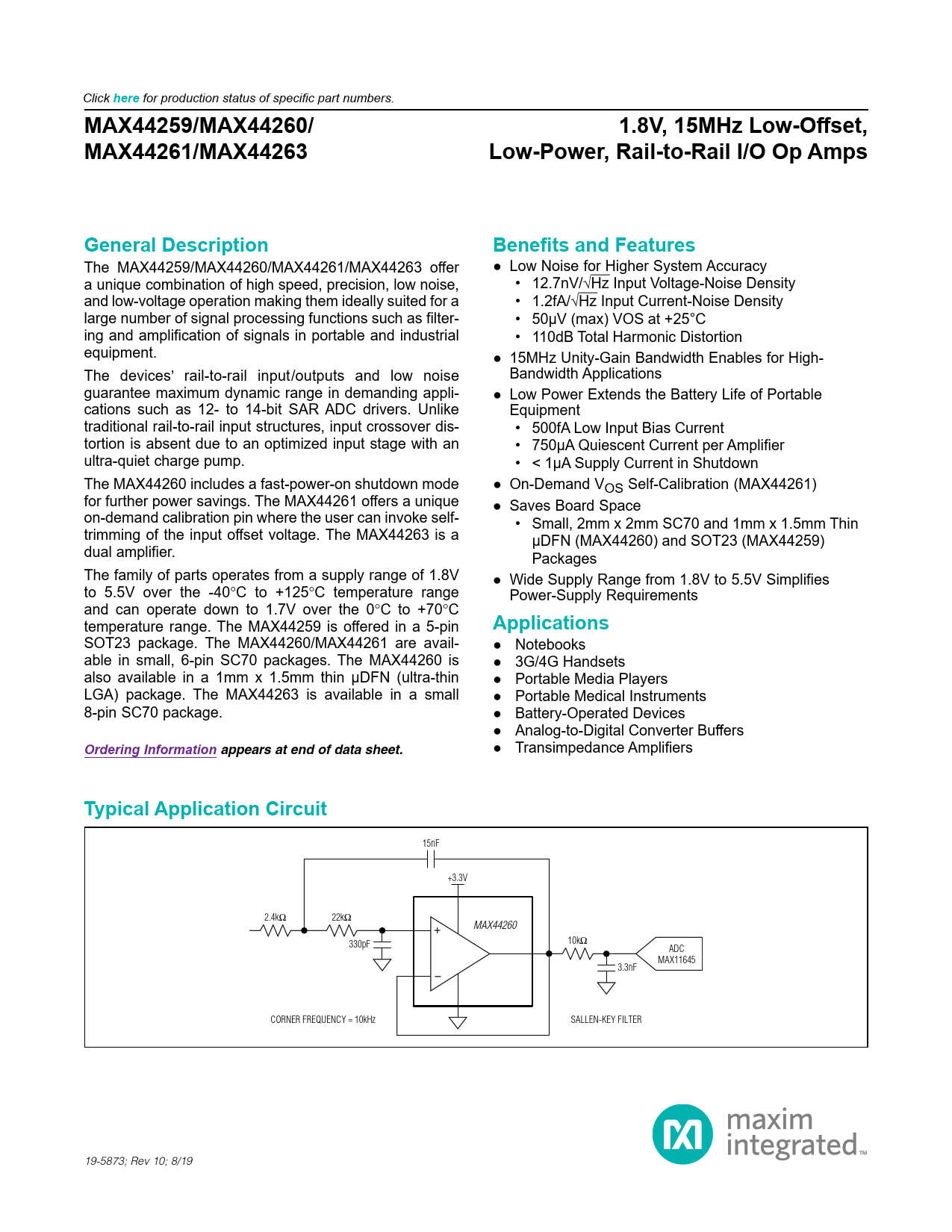 link to page 12 Click here for production status of specific part numbers. MAX44259/MAX44260/1.8V, 15MHz Low-Offset,MAX44261/MAX44263Low-Power, Rail-to-Rail I/O Op AmpsGeneral DescriptionBenefits and Features The MAX44259/MAX44260/MAX44261/MAX44263 offer ● Low Noise for Higher System Accuracy a unique combination of high speed, precision, low noise, • 12.7nV/√Hz Input Voltage-Noise Density and low-voltage operation making them ideally suited for a • 1.2fA/√Hz Input Current-Noise Density large number of signal processing functions such as filter- • 50µV (max) VOS at +25°C ing and amplification of signals in portable and industrial • 110dB Total Harmonic Distortion equipment. ● 15MHz Unity-Gain Bandwidth Enables for High- The devices’ rail-to-rail input/outputs and low noise Bandwidth Applications guarantee maximum dynamic range in demanding appli- ● Low Power Extends the Battery Life of Portable cations such as 12- to 14-bit SAR ADC drivers. Unlike Equipment traditional rail-to-rail input structures, input crossover dis- • 500fA Low Input Bias Current tortion is absent due to an optimized input stage with an • 750µA Quiescent Current per Amplifier ultra-quiet charge pump. • < 1µA Supply Current in Shutdown The MAX44260 includes a fast-power-on shutdown mode ● On-Demand VOS Self-Calibration (MAX44261) for further power savings. The MAX44261 offers a unique ● Saves Board Space on-demand calibration pin where the user can invoke self- • Small, 2mm x 2mm SC70 and 1mm x 1.5mm Thin trimming of the input offset voltage. The MAX44263 is a µDFN (MAX44260) and SOT23 (MAX44259) dual amplifier. Packages The family of parts operates from a supply range of 1.8V ● Wide Supply Range from 1.8V to 5.5V Simplifies to 5.5V over the -40NC to +125NC temperature range Power-Supply Requirements and can operate down to 1.7V over the 0NC to +70NC temperature range. The MAX44259 is offered in a 5-pin Applications SOT23 package. The MAX44260/MAX44261 are avail- ● Notebooks able in small, 6-pin SC70 packages. The MAX44260 is ● 3G/4G Handsets also available in a 1mm x 1.5mm thin µDFN (ultra-thin ● Portable Media Players LGA) package. The MAX44263 is available in a small ● Portable Medical Instruments 8-pin SC70 package. ● Battery-Operated Devices ● Analog-to-Digital Converter Buffers Ordering Information appears at end of data sheet. ● Transimpedance Amplifiers Typical Application Circuit 15nF +3.3V 2.4kI 22kI MAX44260 330pF 10kI ADC MAX11645 3.3nF CORNER FREQUENCY = 10kHz SALLEN-KEY FILTER 19-5873; Rev 10; 8/19