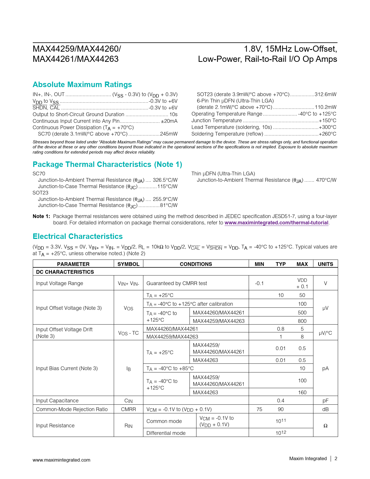 MAX44259/MAX44260/ 1.8V, 15MHz Low-Offset, MAX44261/MAX44263 Low-Power, Rail-to-Rail I/O Op Amps Absolute Maximum Ratings IN+, IN-, OUT .. (VSS - 0.3V) to (VDD + 0.3V) SOT23 (derate 3.9mW/NC above +70NC) ...312.6mW VDD to VSS ..-0.3V to +6V 6-Pin Thin µDFN (Ultra-Thin LGA) SHDN, CAL ...-0.3V to +6V (derate 2.1mW/NC above +70NC) ...110.2mW Output to Short-Circuit Ground Duration .. 10s Operating Temperature Range .. -40NC to +125NC Continuous Input Current into Any Pin .. Q20mA Junction Temperature ...+150NC Continuous Power Dissipation (TA = +70NC) Lead Temperature (soldering, 10s) ..+300NC SC70 (derate 3.1mW/NC above +70NC) ..245mW Soldering Temperature (reflow) ..+260NC Stresses beyond those listed under “Absolute Maximum Ratings” may cause permanent damage to the device. These are stress ratings only, and functional operation of the device at these or any other conditions beyond those indicated in the operational sections of the specifications is not implied. Exposure to absolute maximum rating conditions for extended periods may affect device reliability. Package Thermal Characteristics (Note 1) SC70 Thin µDFN (Ultra-Thin LGA) Junction-to-Ambient Thermal Resistance (BJA) .. 326.5NC/W Junction-to-Ambient Thermal Resistance (BJA) ... 470NC/W Junction-to-Case Thermal Resistance (BJC) ...115NC/W SOT23 Junction-to-Ambient Thermal Resistance (BJA) .. 255.9NC/W Junction-to-Case Thermal Resistance (BJC) ...81NC/W Note 1: Package thermal resistances were obtained using the method described in JEDEC specification JESD51-7, using a four-layer board. For detailed information on package thermal considerations, refer to www.maximintegrated.com/thermal-tutorial . Electrical Characteristics (VDD = 3.3V, VSS = 0V, VIN+ = VIN- = VDD/2, RL = 10kI to VDD/2, VCAL = VSHDN = VDD, TA = -40NC to +125NC. Typical values are at TA = +25NC, unless otherwise noted.) (Note 2) PARAMETER SYMBOL CONDITIONS MIN TYP MAX UNITS DC CHARACTERISTICS VDD Input Voltage Range VIN+ VIN- Guaranteed by CMRR test -0.1 V + 0.1 TA = +25NC 10 50 TA = -40°C to +125°C after calibration 100 Input Offset Voltage (Note 3) VOS FV TA = -40°C to MAX44260/MAX44261 500 +125°C MAX44259/MAX44263 800 Input Offset Voltage Drift MAX44260/MAX44261 0.8 5 V (Note 3) OS - TC FV/NC MAX44259/MAX44263 1 8 MAX44259/ 0.01 0.5 TA = +25NC MAX44260/MAX44261 MAX44263 0.01 0.5 Input Bias Current (Note 3) IB TA = -40NC to +85NC 10 pA MAX44259/ TA = -40NC to 100 MAX44260/MAX44261 +125NC MAX44263 160 Input Capacitance CIN 0.4 pF Common-Mode Rejection Ratio CMRR VCM = -0.1V to (VDD + 0.1V) 75 90 dB V Common mode CM = -0.1V to 1011 Input Resistance RIN (VDD + 0.1V) Ω Differential mode 1012 www.maximintegrated.com Maxim Integrated │ 2