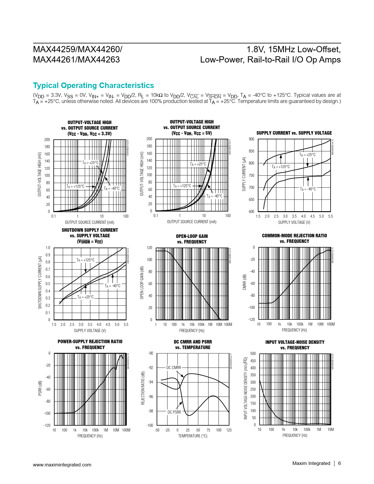 MAX44259/MAX44260/ 1.8V, 15MHz Low-Offset, MAX44261/MAX44263 Low-Power, Rail-to-Rail I/O Op Amps Typical Operating Characteristics (VDD = 3.3V, VSS = 0V, VIN+ = VIN- = VDD/2, RL = 10kI to VDD/2, VCAL = VSHDN = VDD, TA = -40NC to +125NC. Typical values are at TA = +25NC, unless otherwise noted. All devices are 100% production tested at TA = +25NC. Temperature limits are guaranteed by design.) OUTPUT-VOLTAGE HIGH OUTPUT-VOLTAGE HIGH vs. OUTPUT SOURCE CURRENT vs. OUTPUT SOURCE CURRENT (VCC - VOH, VCC = 3.3V) (VCC - VOH, VCC = 5V) SUPPLY CURRENT vs. SUPPLY VOLTAGE 200 200 900 180 180 850 160 MAX44260 toc10 160 MAX44260 toc11 MAX44260 toc12 TA = +25°C 140 T 140 A = +25°C TA = +25°C 800 120 120 TA = +125°C 100 100 750 80 80 TA = +125°C TA = +125°C 700 60 TA = -40°C 60 SUPPLY CURRENT (µA) TA = -40°C OUTPUT-VOLTAGE HIGH (mV) OUTPUT-VOLTAGE HIGH (mV) 40 40 TA = -40°C 650 20 20 0 0 600 0.1 1 10 100 0.1 1 10 100 1.5 2.0 2.5 3.0 3.5 4.0 4.5 5.0 5.5 OUTPUT SOURCE CURRENT (mA) OUTPUT SOURCE CURRENT (mA) SUPPLY VOLTAGE (V) SHUTDOWN SUPPLY CURRENT vs. SUPPLY VOLTAGE OPEN-LOOP GAIN COMMON-MODE REJECTION RATIO (VSHDN = VEE) vs. FREQUENCY vs. FREQUENCY 1.0 120 0 0.9 T 100 -20 0.8 A = +125°C MAX44260 toc13 MAX44260 toc14 MAX44260 toc15 0.7 80 -40 0.6 0.5 -60 T 60 A = -40°C 0.4 CMRR (dB) 40 -80 0.3 TA = +25°C OPEN-LOOP GAIN (dB) SHUTDOWN SUPPLY CURRENT (µA) 0.2 20 -100 0.1 0 0 -120 1.5 2.0 2.5 3.0 3.5 4.0 4.5 5.0 5.5 1 10 100 1k 10k 100k 1M 10M 100M 10 100 1k 10k 100k 1M 10M 100M SUPPLY VOLTAGE (V) FREQUENCY (Hz) FREQUENCY (Hz) POWER-SUPPLY REJECTION RATIO DC CMRR AND PSRR INPUT VOLTAGE-NOISE DENSITY vs. FREQUENCY vs. TEMPERATURE vs. FREQUENCY 0 -90 500 ) 450 -20 √Hz MAX44260 toc16 -92 DC CMRR MAX44260 toc17 400 MAX44260 toc18 -40 350 -94 300 -60 250 PSRR (dB) -96 200 -80 REJECTION RATIO (dB) 150 -98 100 -100 DC PSRR INPUT VOLTAGE-NOISE DENSITY (nV/ 50 -120 -100 0 10 100 1k 10k 100k 1M 10M 100M -50 -25 0 25 50 75 100 125 10 100 1k 10k 100k 1M 10M FREQUENCY (Hz) TEMPERATURE (°C) FREQUENCY (Hz) www.maximintegrated.com Maxim Integrated │ 6