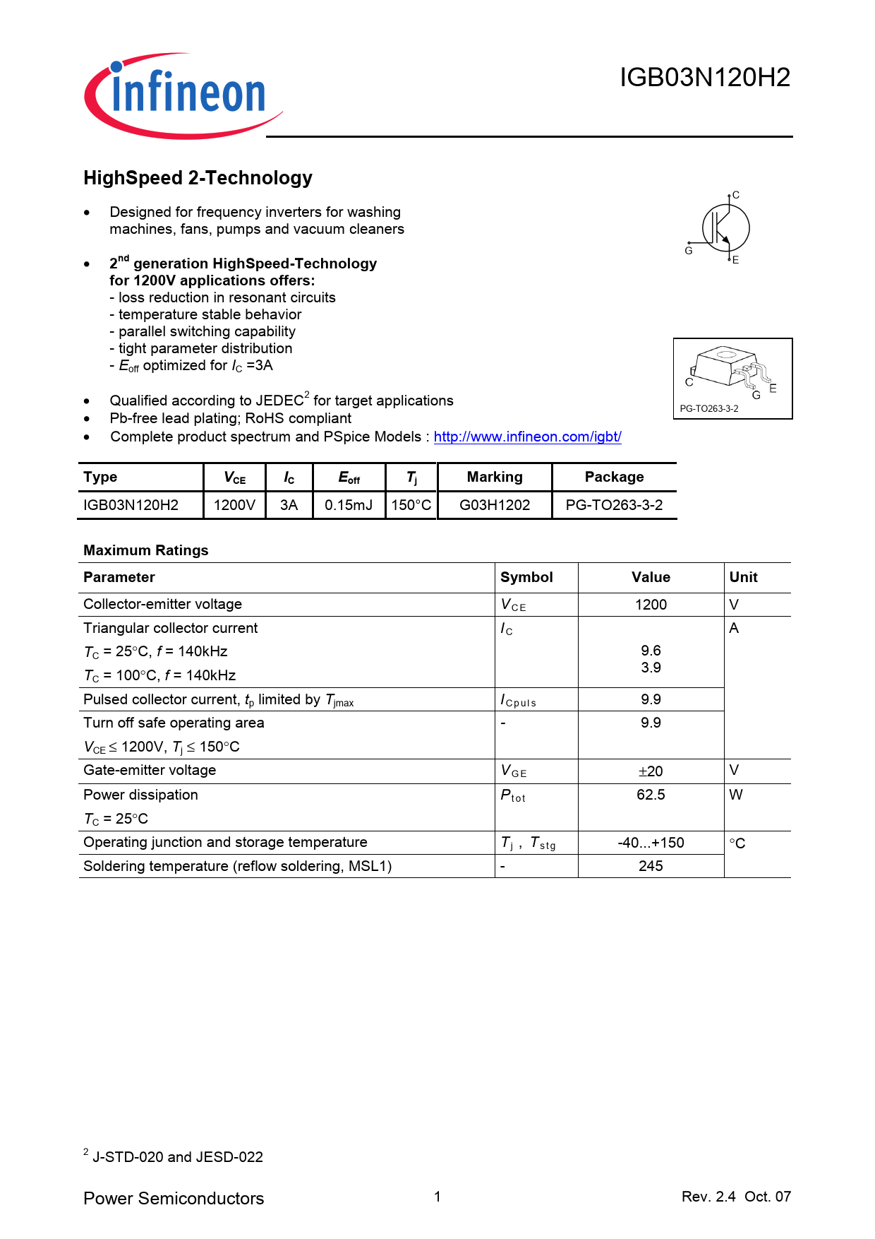 - loss reduction in resonant circuits - temperature stable behavior - parallel switching capability - tight parameter distribution - Eoff optimized for IC =3A • Qualified according to JEDEC2 for target applications • PG-TO263-3-2 Pb-free lead plating; RoHS compliant • Complete product spectrum and PSpice Models : http://www.infineon.com/igbt/
