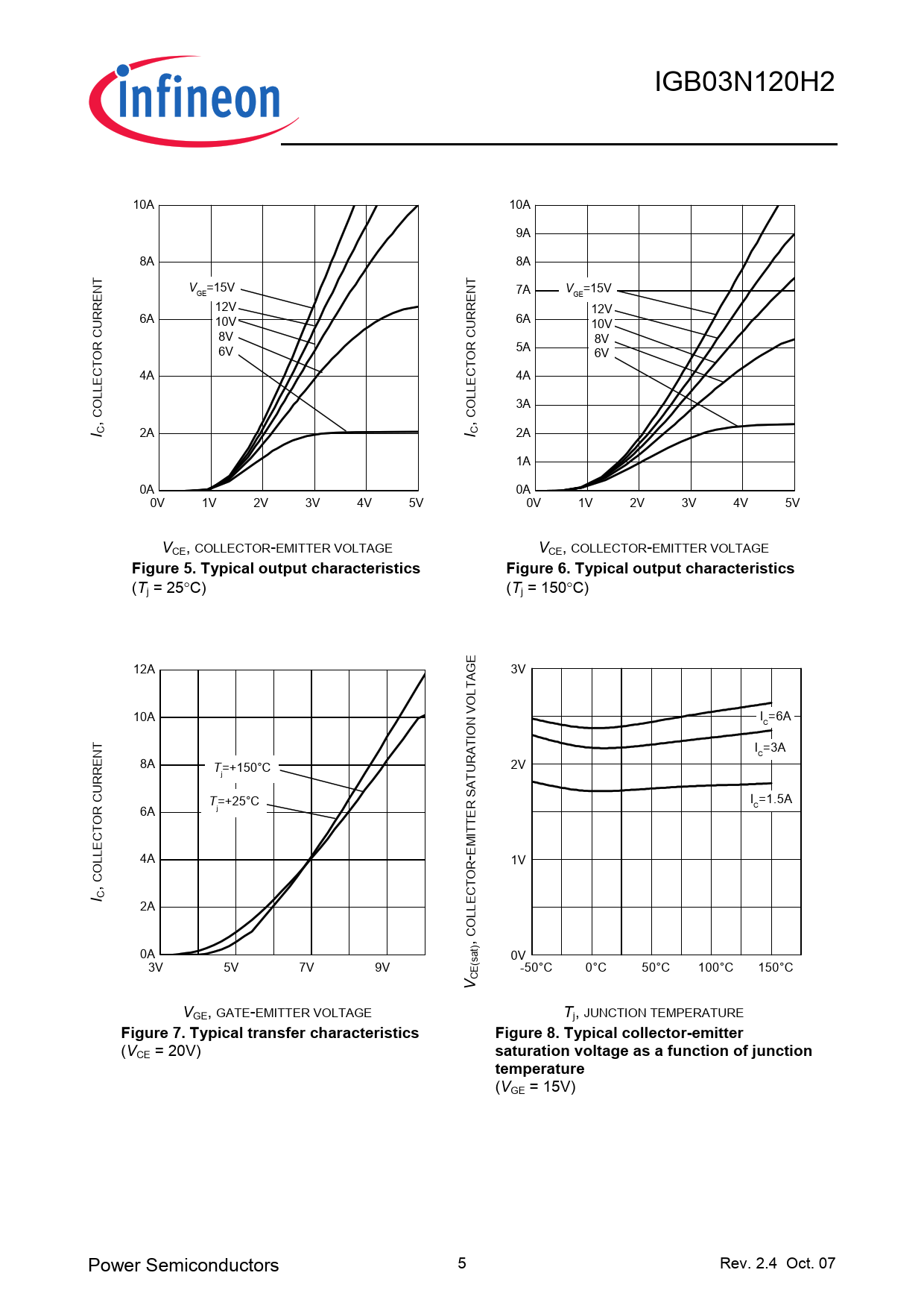 IGB03N120H2 10A 10A 9A 8A 8A T T N V =15V N 7A V =15V GE GE 12V 12V 6A 10V 6A 10V 8V 8V 5A OR CURRE 6V OR CURRE 6V CT 4A CT 4A 3A , COLLE , COLLE I C 2A I C 2A 1A 0A 0A 0V 1V 2V 3V 4V 5V 0V 1V 2V 3V 4V 5V VCE, COLLECTOR-EMITTER VOLTAGE VCE, COLLECTOR-EMITTER VOLTAGE Figure 5. Typical output characteristicsFigure 6. Typical output characteristics (Tj = 25°C) (Tj = 150°C) E 12A G 3V A LT O 10A V N I =6A C O TI NT A I =3A C 8A R T =+150°C U 2V j T T =+25°C SA I =1.5A 6A j R C OR CURRE TE CT IT M 4A -E 1V OR , COLLE I C CT 2A , COLLE 0A 0V 3V 5V 7V 9V -50°C 0°C 50°C 100°C 150°C V CE(sat) VGE, GATE-EMITTER VOLTAGE Tj, JUNCTION TEMPERATURE Figure 7. Typical transfer characteristicsFigure 8. Typical collector-emitter (VCE = 20V) saturation voltage as a function of junction temperature (VGE = 15V) Power Semiconductors 5 Rev. 2.4 Oct. 07
