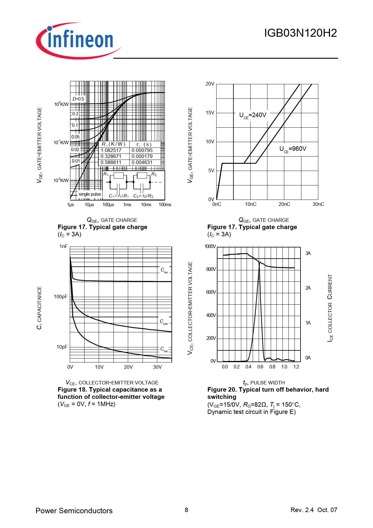 IGB03N120H2 20V D=0.5 100K/W E E 15V AG 0.2 AG U =240V CE LT LT 0.1 VO VO 0.05 TER TER 10V IT 10-1K/W R , ( K / W ) τ , ( s ) IT M 0.02 1.082517 0.000795 M U =960V -E -E CE 0.328671 0.000179 TE 0.01 TE 0.588811 0.004631 , GA , GA 5V R1 R2 V GE 10-2K/W V GE single pulse C1=τ1/R1 C2=τ2/R2 0V 1µs 10µs 100µs 1ms 10ms 100ms 0nC 10nC 20nC 30nC QGE, GATE CHARGE QGE, GATE CHARGE