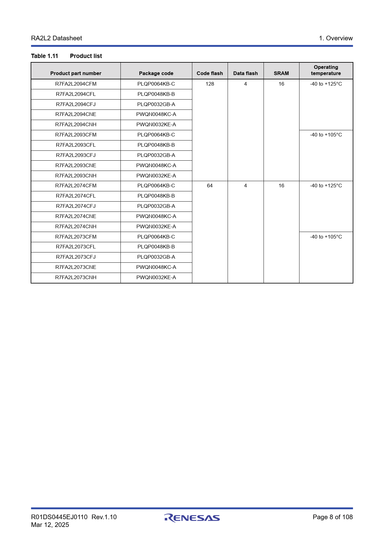 Table 1.11 Product list Operating Product part number Package code Code flash Data flash SRAM temperature