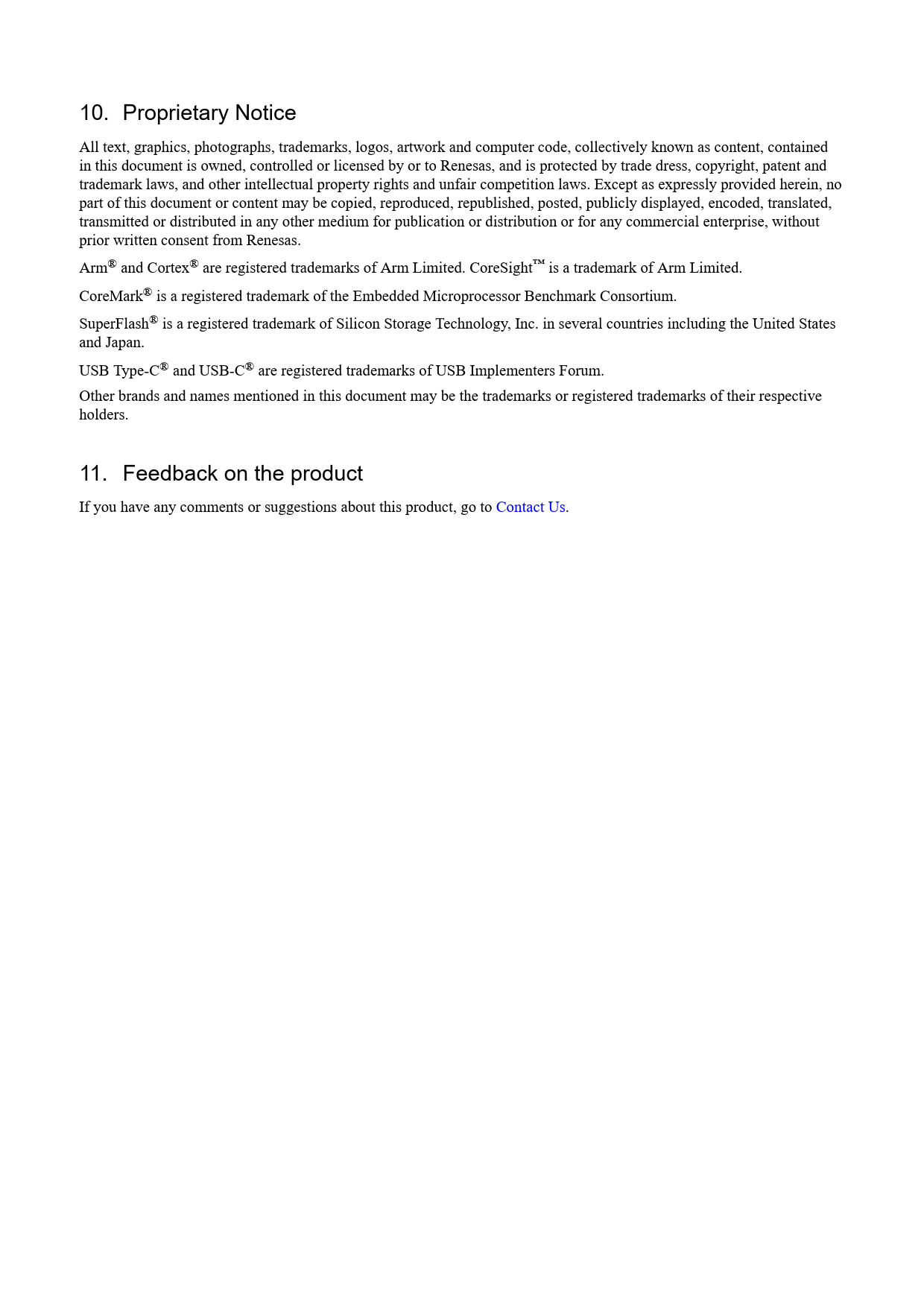 10. Proprietary Notice All text, graphics, photographs, trademarks, logos, artwork and computer code, collectively known as content, contained in this document is owned, controlled or licensed by or to Renesas, and is protected by trade dress, copyright, patent and trademark laws, and other intellectual property rights and unfair competition laws. Except as expressly provided herein, no part of this document or content may be copied, reproduced, republished, posted, publicly displayed, encoded, translated, transmitted or distributed in any other medium for publication or distribution or for any commercial enterprise, without prior written consent from Renesas. Arm® and Cortex® are registered trademarks of Arm Limited. CoreSight™ is a trademark of Arm Limited. CoreMark® is a registered trademark of the Embedded Microprocessor Benchmark Consortium. SuperFlash® is a registered trademark of Silicon Storage Technology, Inc. in several countries including the United States and Japan. USB Type-C® and USB-C® are registered trademarks of USB Implementers Forum. Other brands and names mentioned in this document may be the trademarks or registered trademarks of their respective holders. 11. Feedback on the product If you have any comments or suggestions about this product, go to Contact Us. Document Outline Cover Notice General Precautions Preface Contents Features 1. Overview 1.1 Function Outline 1.2 Block Diagram 1.3 Part Numbering 1.4 Function Comparison 1.5 Pin Functions 1.6 Pin Assignments 1.7 Pin Lists 2. CPU 2.1 Overview 2.1.1 CPU 2.1.2 Debug 2.1.3 Operating Frequency 2.1.4 Block Diagram 2.2 Implementation Options 2.3 SWD Interface 2.4 Debug Function 2.4.1 Debug Mode Definition 2.4.2 Debug Mode Effects 2.4.2.1 Low power mode 2.4.2.2 Reset 2.5 Programmers Model 2.5.1 Address Spaces 2.5.2 Cortex-M23 Peripheral Address Map 2.5.3 External Debug Address Map 2.5.4 CoreSight ROM Table 2.5.4.1 ROM entries 2.5.4.2 CoreSight component registers 2.5.5 DBGREG Module 2.5.5.1 DBGSTR : Debug Status Register 2.5.5.2 DBGSTOPCR : Debug Stop Control Register 2.5.5.3 DBGREG CoreSight component registers 2.5.6 OCDREG Module 2.5.6.1 IAUTHn : ID Authentication Code Register (n = 0 to 3) 2.5.6.2 MCUSTAT : MCU Status Register 2.5.6.3 MCUCTRL : MCU Control Register 2.5.6.4 OCDREG CoreSight component registers 2.6 SysTick Timer 2.7 OCD Emulator Connection 2.7.1 Unlock ID Code 2.7.2 DBGEN 2.7.3 Restrictions on Connecting an OCD emulator 2.7.3.1 Starting connection while in low power mode 2.7.3.2 Changing low power mode while in OCD mode 2.7.3.3 Modify the unlock ID code in OSIS 2.7.3.4 Connecting sequence and SWD authentication 2.8 References 2.9 Usage Notes 3. Operating Modes 3.1 Operating Mode Types and Selection 3.2 Details of Operating Modes 3.2.1 Single-Chip Mode 3.2.2 SCI Boot Mode or I2C Boot Mode 3.3 Operating Modes Transitions 3.3.1 Operating Mode Transitions as Determined by the Mode-Setting Pin 4. Address Space 4.1 Address Space 5. Resets 5.1 Overview 5.2 Register Descriptions 5.2.1 RSTSR0 : Reset Status Register 0 5.2.2 RSTSR1 : Reset Status Register 1 5.2.3 RSTSR2 : Reset Status Register 2 5.3 Operation 5.3.1 RES Pin Reset 5.3.2 Power-On Reset 5.3.3 Voltage Monitor Reset 5.3.4 Independent Watchdog Timer Reset 5.3.5 Watchdog Timer Reset 5.3.6 Software Reset 5.3.7 Determination of Cold/Warm Start 5.3.8 Determination of Reset Generation Source 5.4 Usage Notes 5.4.1 Note on RES pin reset 6. Option-Setting Memory 6.1 Overview 6.2 Register Descriptions 6.2.1 OFS0 : Option Function Select Register 0 6.2.2 OFS1 : Option Function Select Register 1 6.2.3 MPU Registers 6.2.4 AWS : Access Window Setting Register 6.2.5 OSIS : OCD/Serial Programmer ID Setting Register 6.3 Setting Option-Setting Memory 6.3.1 Allocation of Data in Option-Setting Memory 6.3.2 Setting Data for Programming Option-Setting Memory 6.4 Usage Notes 6.4.1 Data for Programming Reserved Areas and Reserved Bits in the Option-Setting Memory 6.4.2 Note on FSPR Bit 7. Low Voltage Detection (LVD) 7.1 Overview 7.2 Register Descriptions 7.2.1 LVCMPCR : Voltage Monitor Circuit Control Register 7.2.2 LVDLVLR : Voltage Detection Level Select Register 7.2.3 LVD1CR0 : Voltage Monitor 1 Circuit Control Register 0 7.2.4 LVD2CR0 : Voltage Monitor 2 Circuit Control Register 0 7.2.5 LVD1CR1 : Voltage Monitor 1 Circuit Control Register 7.2.6 LVD1SR : Voltage Monitor 1 Circuit Status Register 7.2.7 LVD2CR1 : Voltage Monitor 2 Circuit Control Register 1 7.2.8 LVD2SR : Voltage Monitor 2 Circuit Status Register 7.3 VCC Input Voltage Monitor 7.3.1 Monitoring Vdet0 7.3.2 Monitoring Vdet1 7.3.3 Monitoring Vdet2 7.4 Reset from Voltage Monitor 0 7.5 Interrupt and Reset from Voltage Monitor 1 7.6 Interrupt and Reset from Voltage Monitor 2 7.7 Event Link Controller (ELC) Output 7.7.1 Interrupt Handling and Event Linking 8. Clock Generation Circuit 8.1 Overview 8.2 Register Descriptions 8.2.1 SCKDIVCR : System Clock Division Control Register 8.2.2 SCKSCR : System Clock Source Control Register 8.2.3 MEMWAIT : Memory Wait Cycle Control Register for Code Flash 8.2.4 FLDWAITR : Memory Wait Cycle Control Register for Data Flash 8.2.5 MOSCCR : Main Clock Oscillator Control Register 8.2.6 SOSCCR : Sub-Clock Oscillator Control Register 8.2.7 LOCOCR : Low-Speed On-Chip Oscillator Control Register 8.2.8 HOCOCR : High-Speed On-Chip Oscillator Control Register 8.2.9 MOCOCR : Middle-Speed On-Chip Oscillator Control Register 8.2.10 OSCSF : Oscillation Stabilization Flag Register 8.2.11 OSTDCR : Oscillation Stop Detection Control Register 8.2.12 OSTDSR : Oscillation Stop Detection Status Register 8.2.13 MOSCWTCR : Main Clock Oscillator Wait Control Register 8.2.14 HOCOWTCR : High-Speed On-Chip Oscillator Wait Control Register 8.2.15 MOMCR : Main Clock Oscillator Mode Oscillation Control Register 8.2.16 SOMCR : Sub-Clock Oscillator Mode Control Register 8.2.17 SOMRG : Sub-Clock Oscillator Margin Check Register 8.2.18 CKOCR : Clock Out Control Register 8.2.19 LOCOUTCR : LOCO User Trimmin