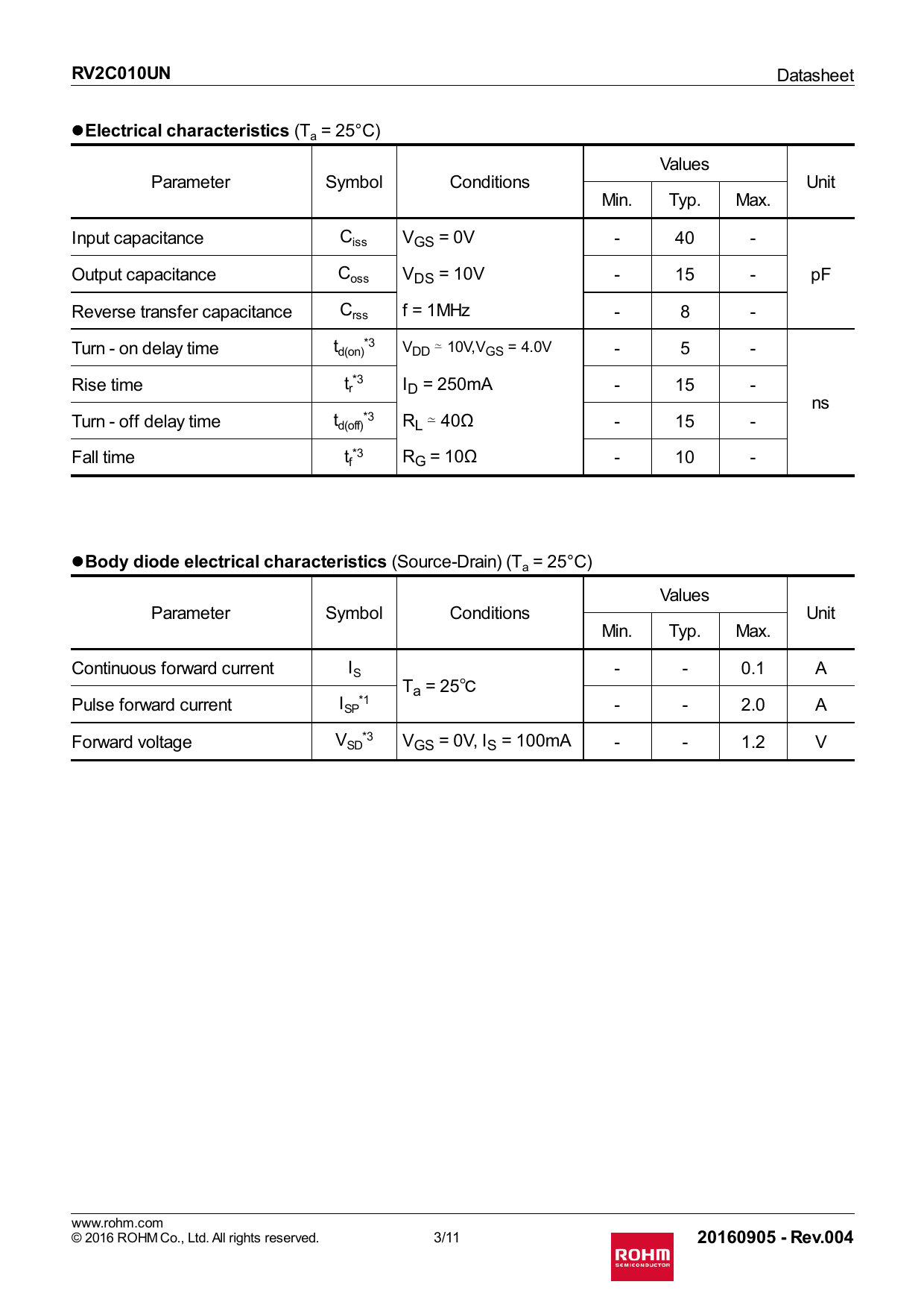 RV2C010UN. Electrical characteristics. Body diode electrical characteristics. 20160905 - Rev.004
