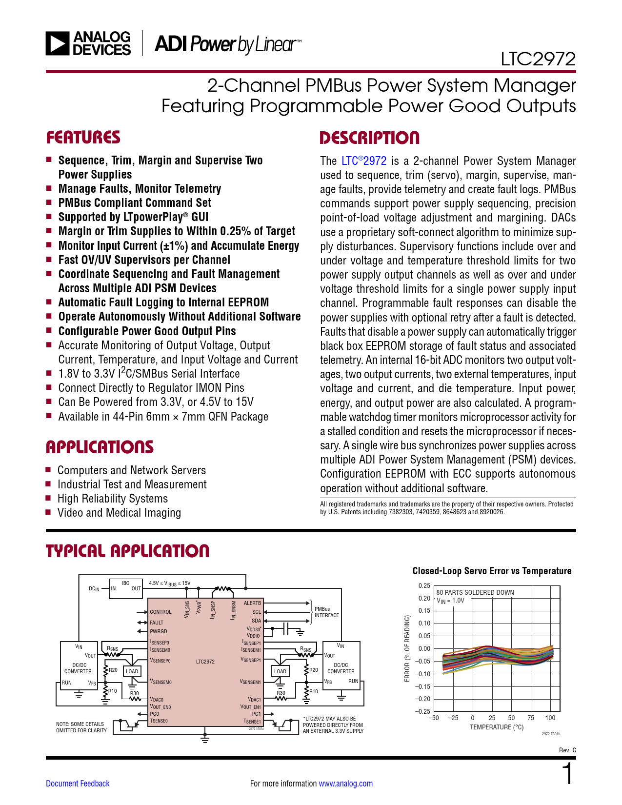 LTC2972 2-Channel PMBus Power System Manager Featuring Programmable Power Good Outputs FEATURESDESCRIPTION n Sequence, Trim, Margin and Supervise Two The LTC®2972 is a 2-channel Power System Manager Power Supplies used to sequence, trim (servo), margin, supervise, man- n Manage Faults, Monitor Telemetry age faults, provide telemetry and create fault logs. PMBus n PMBus Compliant Command Set commands support power supply sequencing, precision n Supported by LTpowerPlay® GUI point-of-load voltage adjustment and margining. DACs n Margin or Trim Supplies to Within 0.25% of Target use a proprietary soft-connect algorithm to minimize sup- n Monitor Input Current (±1%) and Accumulate Energy ply disturbances. Supervisory functions include over and n Fast OV/UV Supervisors per Channel under voltage and temperature threshold limits for two n Coordinate Sequencing and Fault Management power supply output channels as well as over and under Across Multiple ADI PSM Devices voltage threshold limits for a single power supply input n Automatic Fault Logging to Internal EEPROM channel. Programmable fault responses can disable the n Operate Autonomously Without Additional Software power supplies with optional retry after a fault is detected. n Configurable Power Good Output Pins Faults that disable a power supply can automatically trigger n Accurate Monitoring of Output Voltage, Output black box EEPROM storage of fault status and associated Current, Temperature, and Input Voltage and Current telemetry. An internal 16-bit ADC monitors two output volt- n 1.8V to 3.3V I2C/SMBus Serial Interface ages, two output currents, two external temperatures, input n Connect Directly to Regulator IMON Pins voltage and current, and die temperature. Input power, n Can Be Powered from 3.3V, or 4.5V to 15V energy, and output power are also calculated. A program- n Available in 44-Pin 6mm × 7mm QFN Package mable watchdog timer monitors microprocessor activity for a stalled condition and resets the microprocessor if neces- sary. A single wire bus synchronizes power supplies across APPLICATIONS multiple ADI Power System Management (PSM) devices. n Computers and Network Servers Configuration EEPROM with ECC supports autonomous n Industrial Test and Measurement operation without additional software. n High Reliability Systems All registered trademarks and trademarks are the property of their respective owners. Protected n by U.S. Patents including 7382303, 7420359, 8648623 and 8920026. Video and Medical Imaging TYPICAL APPLICATIONClosed-Loop Servo Error vs Temperature IBC 4.5V ≤ VIBUS ≤ 15V DC 0.25 IN IN OUT 80 PARTS SOLDERED DOWN * 0.20 V R ALERTB IN = 1.0V CONTROL SCL PMBus 0.15 V IN_SNS V PW INTERFACE I IN_SNSP I IN_SNSM FAULT SDA 0.10 VDD33* PWRGD VDDIO 0.05 ISENSEP0 ISENSEP1 V V IN RSNS ISENSEM0 ISENSEM1 R IN SNS 0.00 VOUT VOUT VSENSEP0 LTC2972 VSENSEP1 –0.05 DC/DC DC/DC R20 CONVERTER R20 LOAD LOAD CONVERTER –0.10 V RUN V SENSEM0 VSENSEM1 VFB RUN ERROR (% OF READING) FB –0.15 R10 R10 R30 R30 VDAC0 VDAC1 –0.20 VOUT_EN0 VOUT_EN1 PG0 PG1 –0.25 T –50 –25 0 25 50 75 100 SENSE0 T *LTC2972 MAY ALSO BE SENSE1 NOTE: SOME DETAILS POWERED DIRECTLY FROM OMITTED FOR CLARITY 2972 TA01a TEMPERATURE (°C) AN EXTERNAL 3.3V SUPPLY 2972 TA01b Rev. C Document Feedback For more information www.analog.com 1 Document Outline Features Applications Typical Application Description Absolute Maximum Ratings Order Information Pin Configuration Electrical Characteristics PMBus Timing Diagram Typical Performance Characteristics Pin Functions Block Diagram Operation LTC2972 Operation Overview EEPROM AUXFAULTB RESETB VDDIO PMBus Serial Digital Interface PMBus Device Address Processing Commands Addressing and Write Protect PAGE WRITE_PROTECT WRITE PROTECT Pin MFR_PAGE_FF_MASK MFR_I2C_BASE_ADDRESS MFR_COMMAND_PLUS MFR_DATA_PLUS0 and MFR_DATA_PLUS1 MFR_STATUS_PLUS0, and MFR_STATUS_PLUS1 Reading Fault Log Using Command Plus and MFR_DATA_PLUS0 Reading Energy Using MFR_COMMAND_PLUS and MFR_DATA_PLUS0 Peek Operation Using MFR_DATA_PLUS0 Enabling and Disabling Poke Operations Poke Operation Using Mfr_data_plus0 Command Plus Operations Using MFR_DATA_PLUS1 On/Off Control, Margining and Configuration OPERATION ON_OFF_CONFIG MFR_CONFIG_LTC2972 Cascade Sequence ON with Time-Based Sequence OFF MFR_CONFIG2_LTC2972 MFR_CONFIG3_LTC2972 Tracking Supplies On and Off Tracking Implementation MFR_CONFIG_ALL_LTC2972 Programming User EEPROM Space STORE_USER_ALL and RESTORE_USER_ALL MFR_EE_UNLOCK MFR_EE_ERASE MFR_EE_DATA Response When Part Is Busy MFR_EE Erase and Write Programming Time Input Voltage Commands and Limits VIN_ON, VIN_OFF, VIN_OV_FAULT_LIMIT, VIN_OV_WARN_LIMIT, VIN_UV_WARN_LIMIT and VIN_UV_FAULT_LIMIT INPUT Current and ENERGY Energy Measurement and Reporting MFR_EIN MFR_EIN_CONFIG MFR_IIN_CAL_GAIN MFR_IIN_CAL_GAIN_TC MFR_CLEAR_ENERGY Output Voltage Commands and Limits VOUT_MODE VOUT_COMMAND, VOUT_MAX, VOUT_MARGIN_HIGH, VOUT_MARGIN_LOW, VOUT_OV_FAULT_LIMIT, VOUT_OV_WARN_LIMIT, VOUT_UV_WARN_LIMIT, VOUT_UV_FAULT_LIMIT, POWER_GOOD_ON and POWER_GOOD_OFF MFR_VOUT_DISCHARGE_THRESHOLD MFR_DAC_STARTUP MFR_DAC Output CURRENT Commands and Limits IOUT_CAL_GAIN and IOUT_CAL_OFFSET IOUT_OC_WARN_LIMIT MFR_IOUT_CAL_GAIN_TC External Temperature Commands and Limits OT_FAULT_LIMIT, OT_WARN_LIMIT, UT_WARN_LIMIT and UT_FAULT_LIMIT MFR_TEMP_1_GAIN and MFR_TEMP_1_OFFSET MFR_T_SELF_HEAT, MFR_IOUT_CAL_GAIN_TAU_INV and MFR_IOUT_CAL_GAIN_THETA Sequencing Timing Limits and Clock Sharing TON_DELAY, TON_RISE, TON_MAX_FAULT_LIMIT and TOFF_DELAY MFR_RESTART_DELAY Clock Sharing Watchdog Timer and Power Good MFR_PG_CONFIG MFR_PG_GPO MFR_PWRGD_EN MFR_POWERGOOD_ASSERTION_DELAY Watchdog Operation MFR_WATCHDOG_T_FIRST and MFR_WATCHDOG_T Fault Responses Clearing Latched Faults VOUT_OV_FAULT_RESPONSE and VOUT_UV_FAULT_RESPONSE OT_FAULT_RESPONSE, UT_FAULT_RESPONSE, VIN_OV_FAULT_RESPONSE and VIN_UV_FAULT_RESPONSE TON_MAX_FAULT_RESPONSE MFR_RETRY_DELAY MR_RETRY_COUNT Shared External Faul