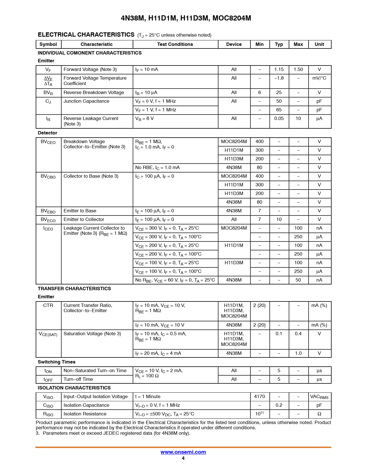 4N38M, H11D1M, H11D3M, MOC8204M ELECTRICAL CHARACTERISTICS Symbol Characteristic Test Conditions Device Min Typ Max Unit