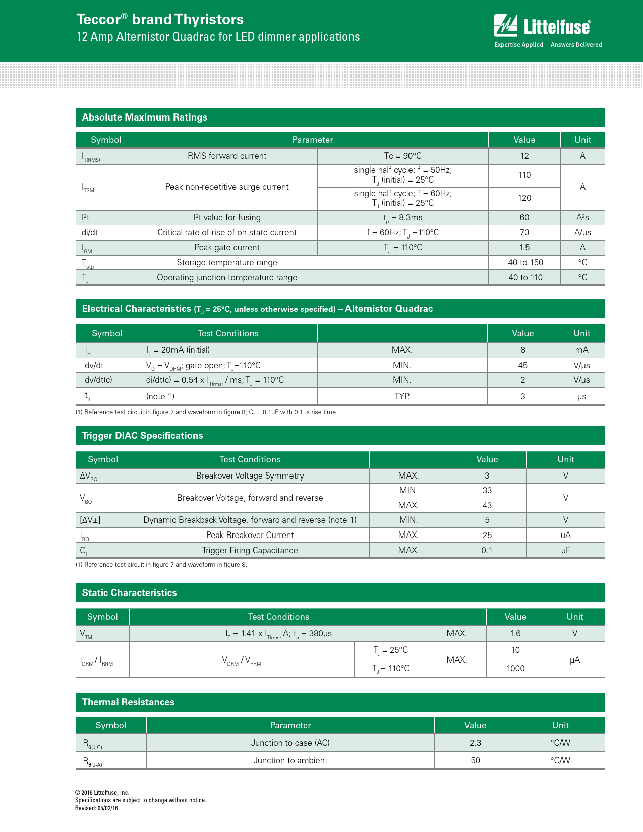 Symbol Parameter Value Unit R Junction to case (AC) 2.3 °C/W θ(J-C) R Junction to ambient 50 °C/W θ(J-A) © 2016 Littelfuse, Inc. Specifications are subject to change without notice. Revised: 05/02/16