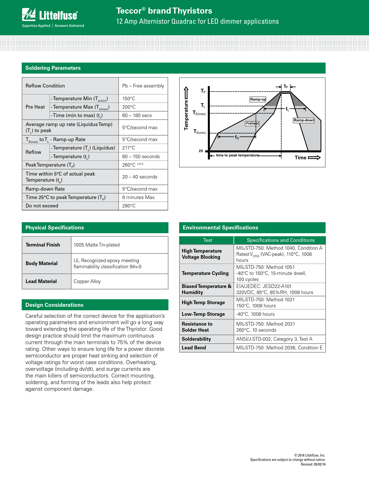 MIL-STD-750: Method 2036, Condition E rating. Other ways to ensure long life for a power discrete semiconductor are proper heat sinking and selection of voltage ratings for worst case conditions. Overheating, overvoltage (including dv/dt), and surge currents are the main killers of semiconductors. Correct mounting, soldering, and forming of the leads also help protect against component damage. © 2016 Littelfuse, Inc. Specifications are subject to change without notice. Revised: 05/02/16