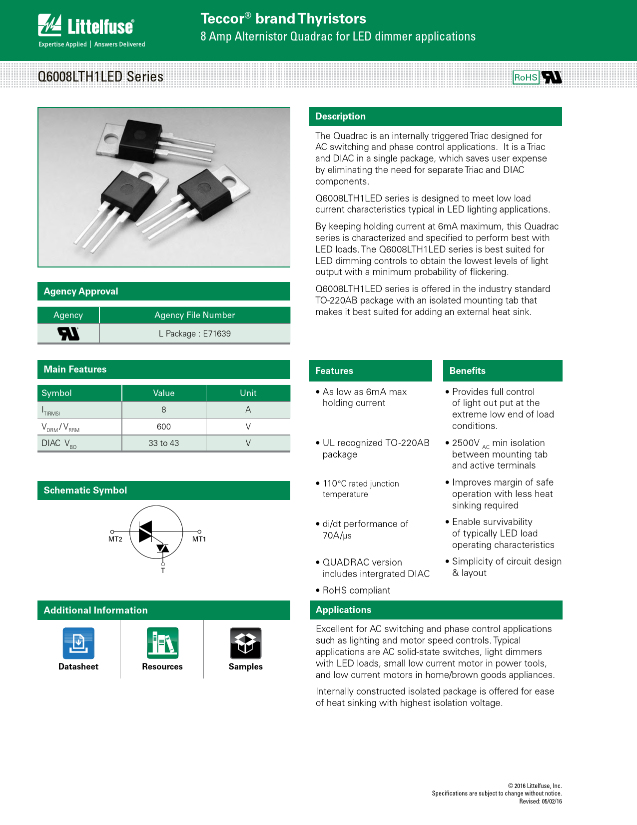 The Quadrac is an internally triggered Triac designed for AC switching and phase control applications. It is a Triac and DIAC in a single package, which saves user expense by eliminating the need for separate Triac and DIAC components. Q6008LTH1LED series is designed to meet low load current characteristics typical in LED lighting applications. By keeping holding current at 6mA maximum, this Quadrac series is characterized and specified to perform best with LED loads. The Q6008LTH1LED series is best suited for LED dimming controls to obtain the lowest levels of light output with a minimum probability of flickering. Q6008LTH1LED series is offered in the industry standard