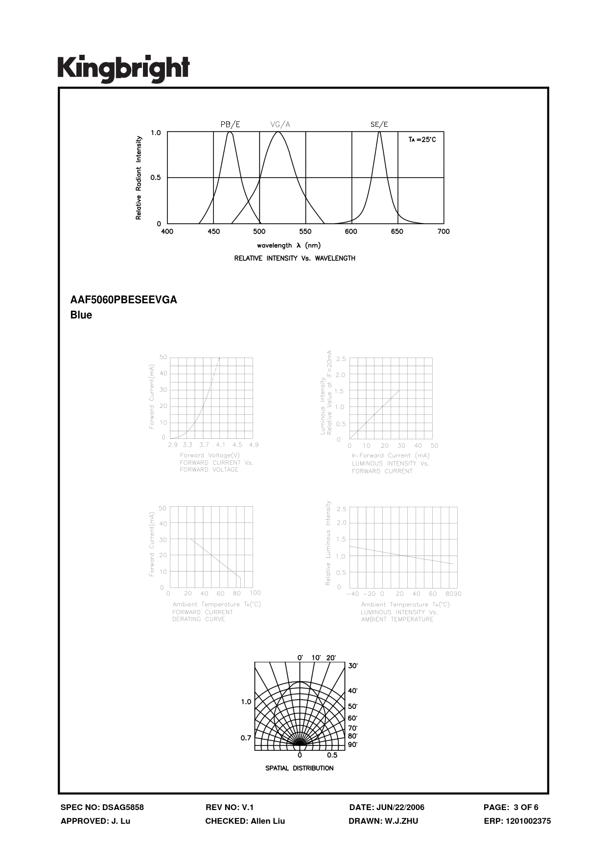| 页数 / 页 | 6 / 3 — AAF5060PBESEEVGA. Blue. SPEC NO: DSAG5858. REV NO: V.1 DATE: JUN/22/2006 … |