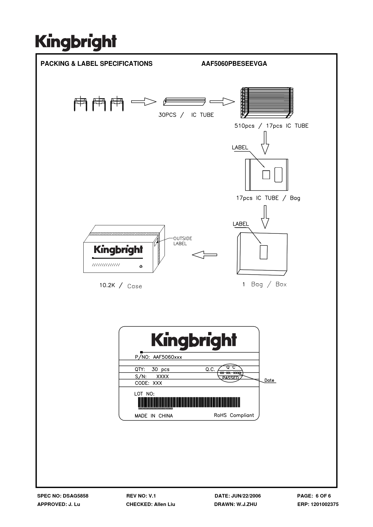 PACKING & LABEL SPECIFICATIONS AAF5060PBESEEVGA SPEC NO: DSAG5858 REV NO: V.1 DATE: JUN/22/2006 PAGE: 6 OF 6 APPROVED: J. Lu CHECKED: Allen Liu DRAWN: W.J.ZHU ERP: 1201002375