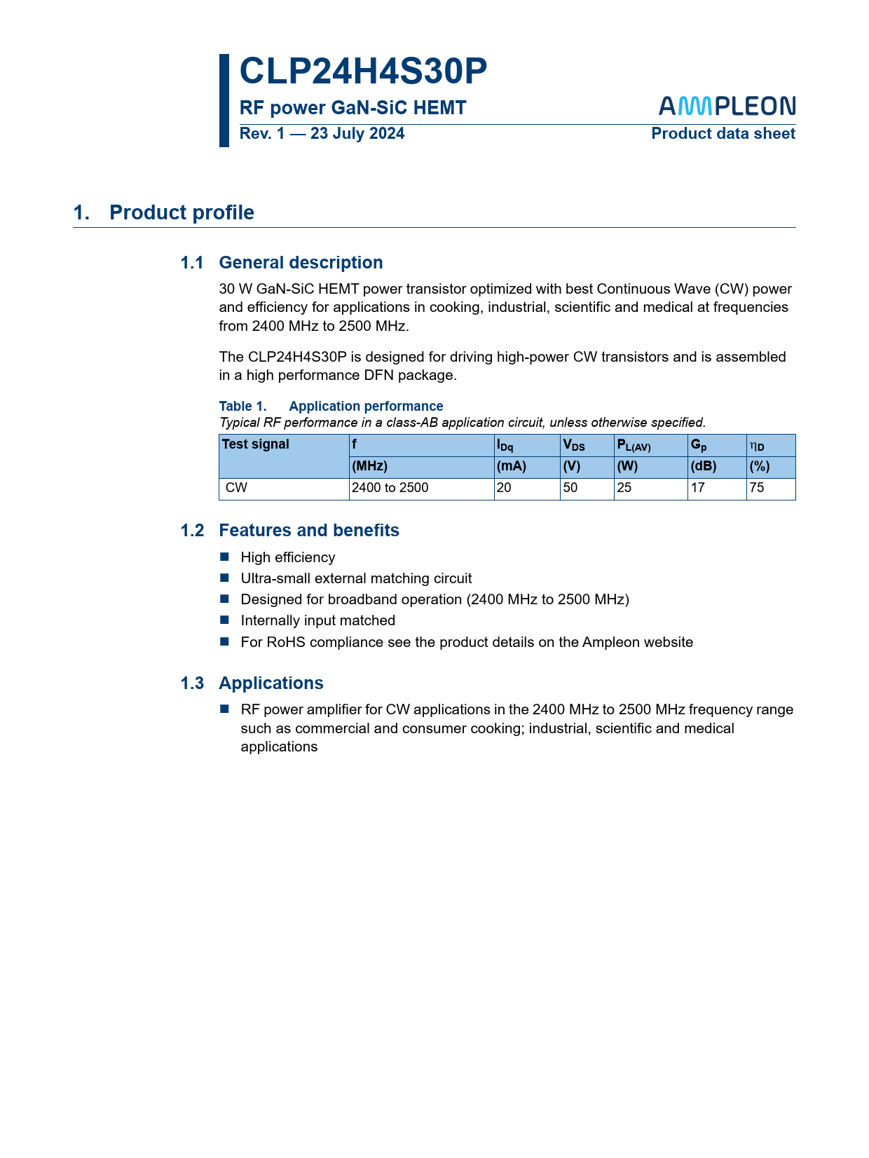 CLP24H4S30P RF power GaN-SiC HEMT Rev. 1 — 23 July 2024. Product data sheet. 1. Product. profile. 1.1 General description