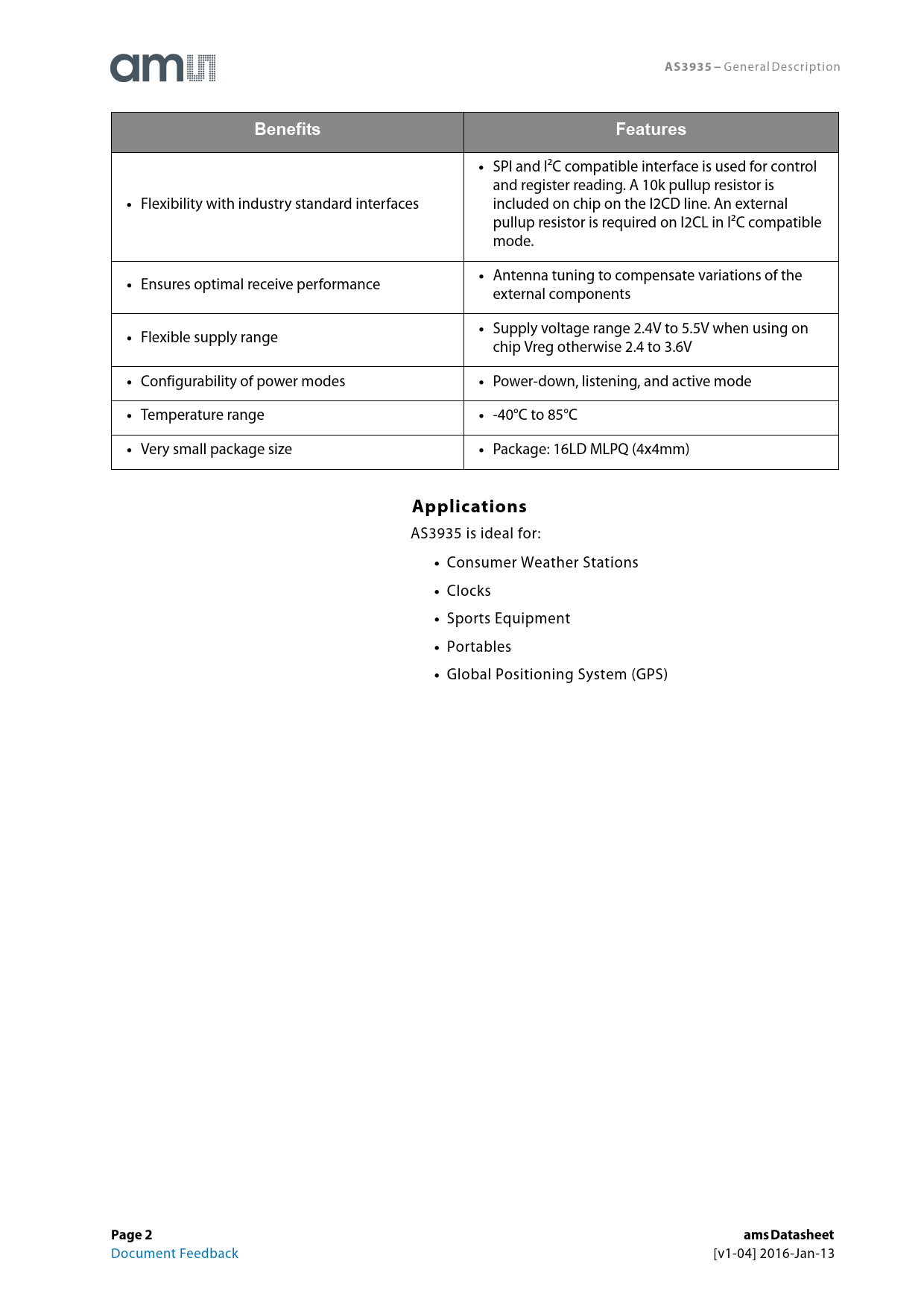 AS3935 − Benefits Features Applications Page 2 ams Datasheet