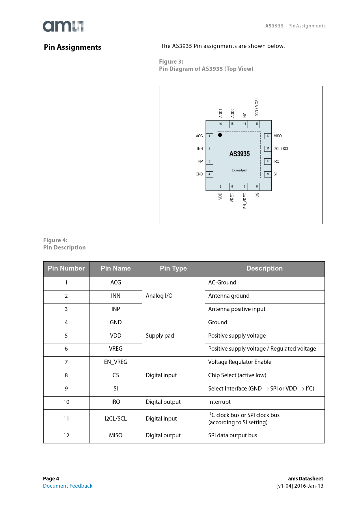 AS3935 −. Pin Assignments. Figure 3: Pin Diagram of AS3935 (Top View). AS3935. Figure 4: Pin Description. Pin Number. Pin Name