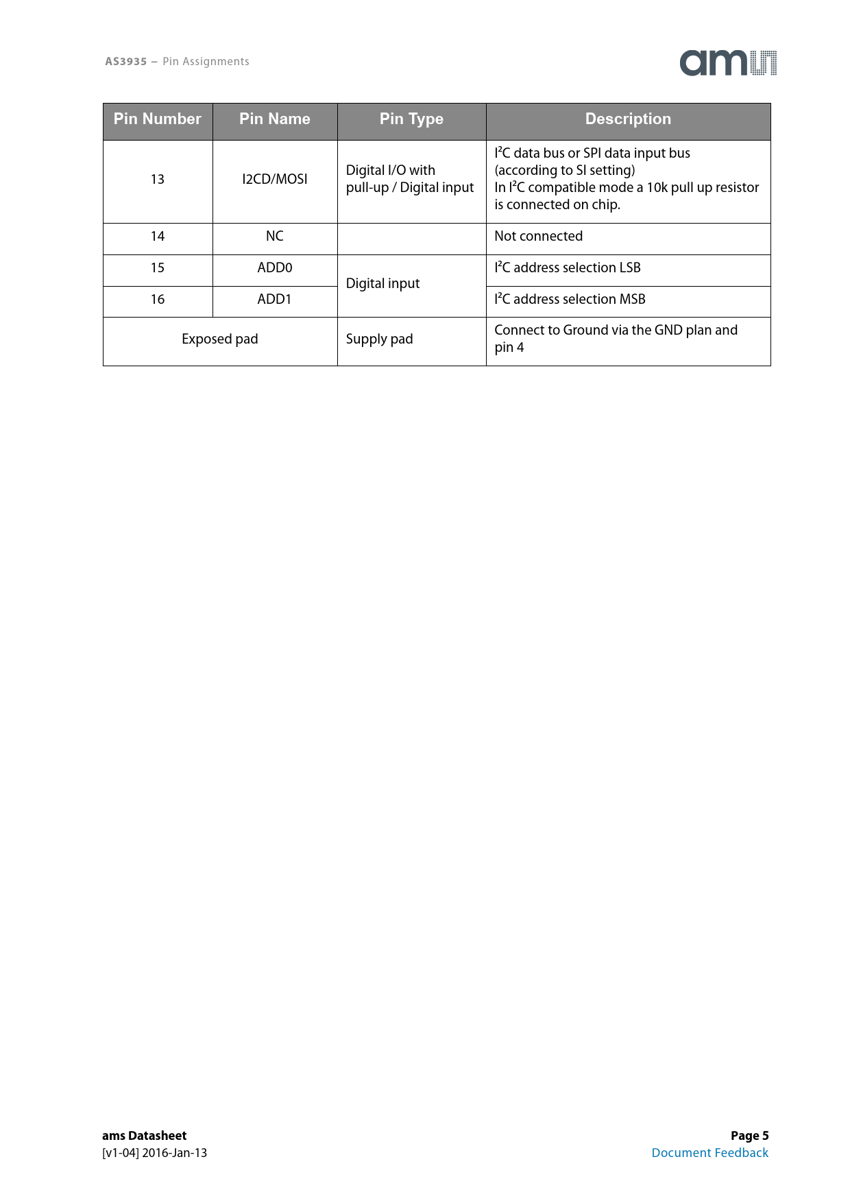 I²C data bus or SPI data input bus Digital I/O with (according to SI setting) 13 I2CD/MOSI pull-up / Digital input In I²C compatible mode a 10k pull up resistor is connected on chip. 14 NC Not connected 15 ADD0 I²C address selection LSB Digital input 16 ADD1 I²C address selection MSB Connect to Ground via the GND plan and Exposed pad Supply pad pin 4