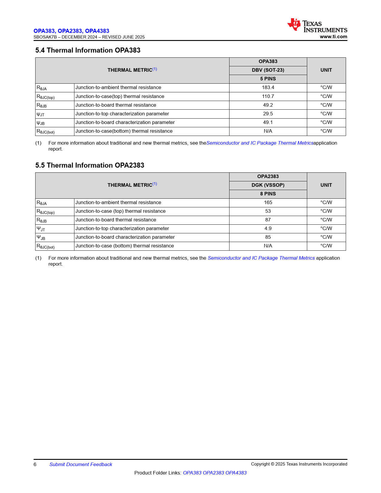 OPA383, OP. A2383, OP. A4383. www.ti.com. 5.4 Thermal Information OPA383. OPA383. THERMAL METRIC. DBV (SOT-23). UNIT. 5 PINS