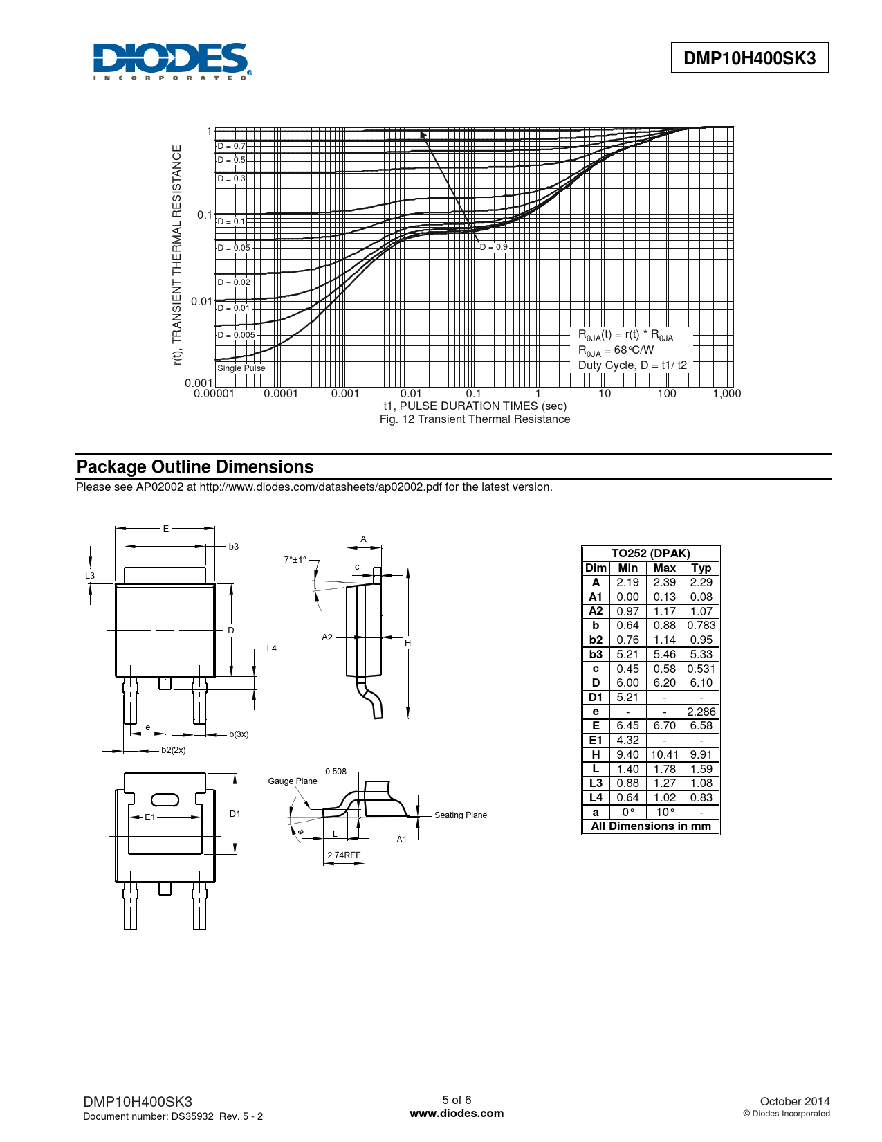 DMP10H400SK3. Package Outline Dimensions. TO252 (DPAK). Dim Min. Max. Typ. All Dimensions in mm. www.diodes.com